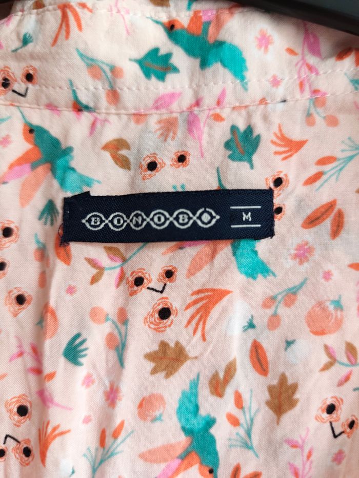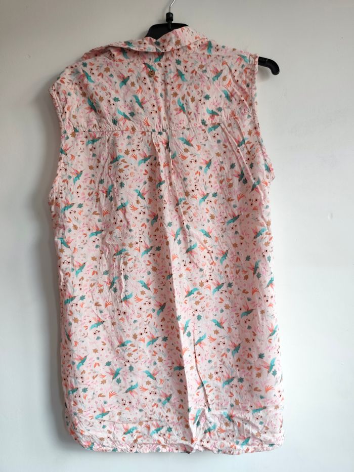 Blouse tunique femme sans manches de la marque Bonobo, coupe fluide et confortable. Coloris rose pâle avec imprimé multicolore (motifs floraux et oiseaux), doux et lumineux. Col en V avec petit boutonnage sur le devant, apportant une touche féminine. Coupe légèrement évasée avec fronces sous la poitrine pour un joli tombé. Matière légère et agréable à porter, idéale pour la mi-saison ou l’été. Facile à associer avec un jean, un short ou un pantalon fluide. #femmevale62100 #hautvale62100 #tailleMvale62100 #bonobo #blouse #tunique #blouseM #tuniqueM