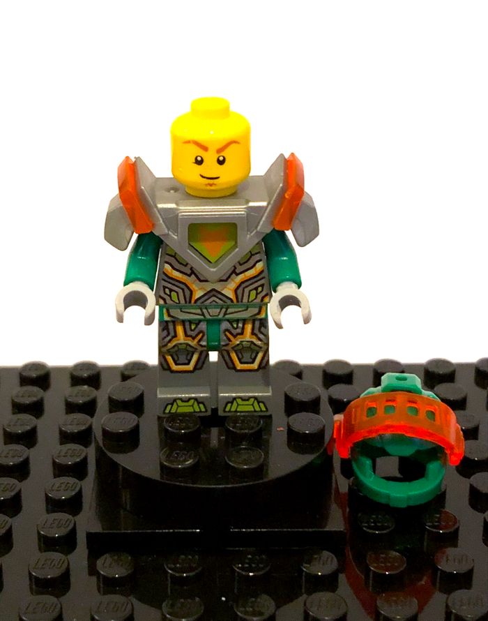 Figurine LEGO Nexo Knights - Aaron Fox, flat silver armor Sets : 70349 - 70355 - 70357 - 70358 Référence : nex068 En bon état, quelques marques d'usure Complète