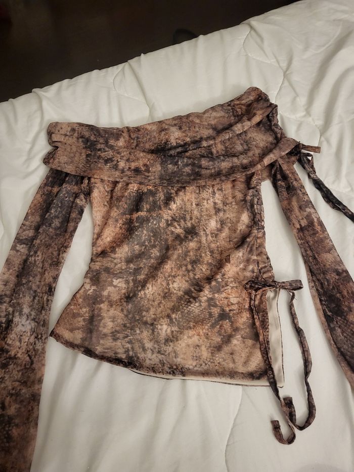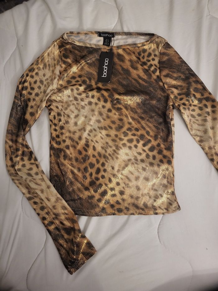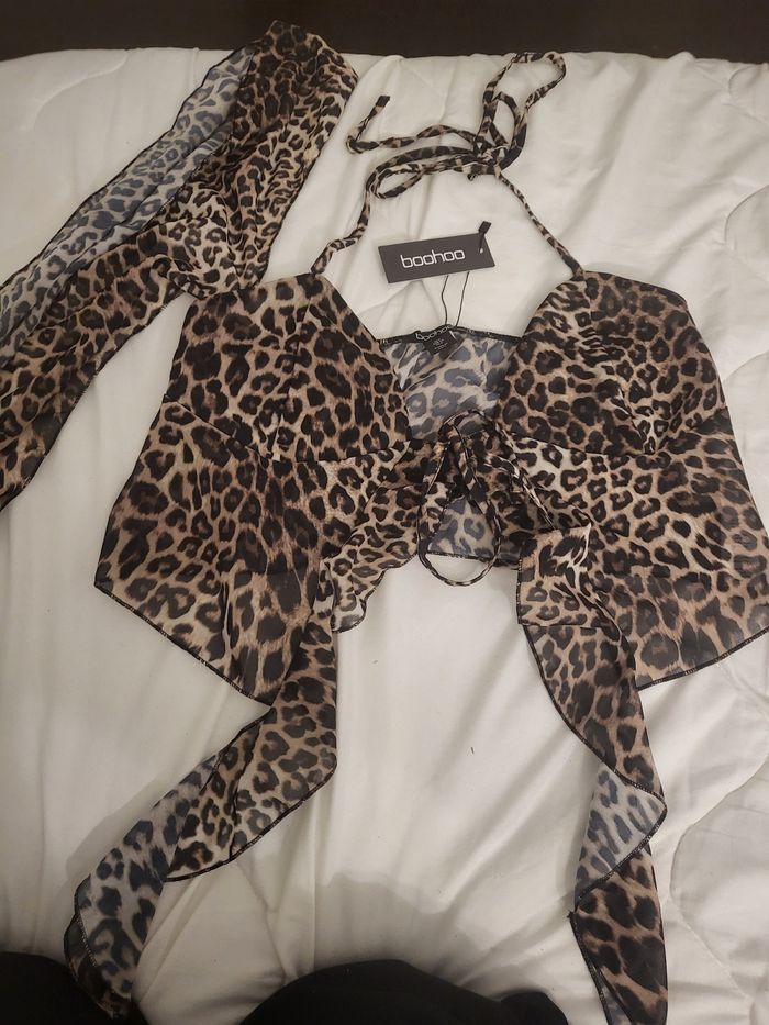 Lot Vêtements Boohoo -top léopard dos nus, decolté, écharpe -top bleu decolté, manches évasé -2 jupes éffet déchirer double épaisseurs -jupe noire fleurie double épaisseurs -jupe bleu doublé, fils côtés, très moulante -pull crop top léopard pailletée -top épaules asymetrique dénudé, doublé, manches évasé non doublé •Taille 36 •neuf •uniquement en lot •8 articles