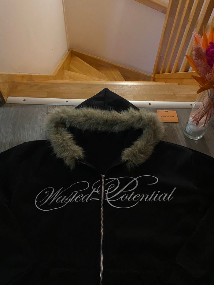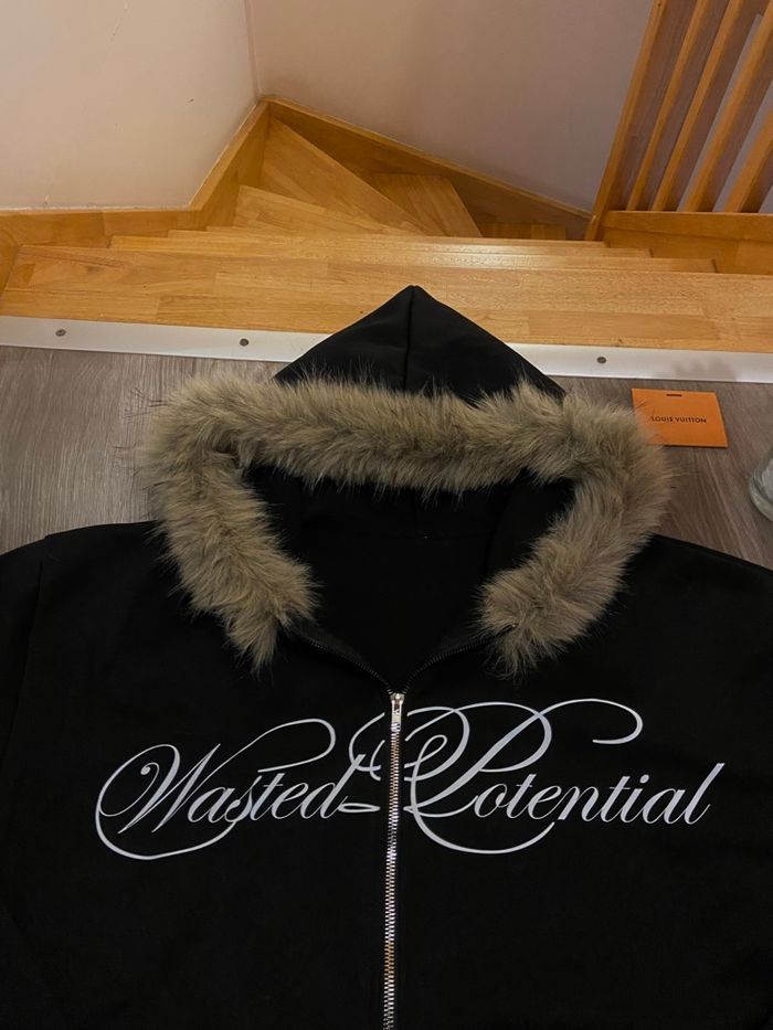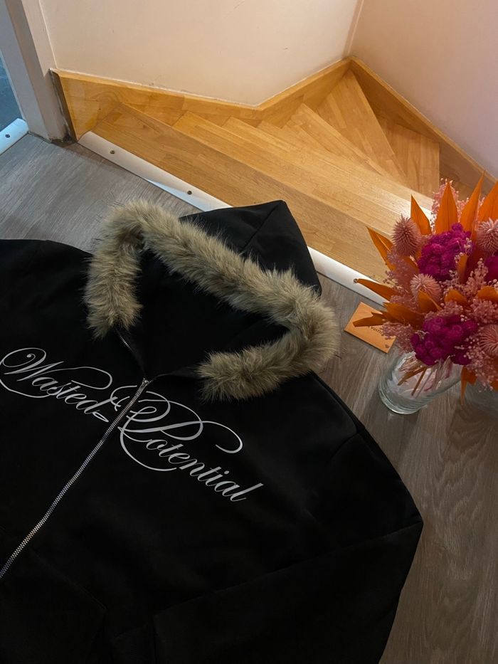 𝜗𝒞・🧸 Zip neuf WASTED POTENTIAL noir vintage à fourrure neuf voir très bon état portée une seule fois ! ◻️ ◻️ - Taille S unisexe, taille large, coupe large. S qui aime les coupes large 68 cm en longueur du zip, 58 cm en largeur. ◻️ - Superbe gilet style Y2K - dark vintage - aesthetic avec capuche fourrure. ◻️ - Zip Wasted potential custom & vintage, la fourrure est fixe et ne peut pas être retirer de la capuche. Envois en moins de 24 heures ◻️ - Porté peu de fois, aucune trace de bouloche ou de trou. ◻️ - Envoi rapide emballage soigné en moins de 24 heures avec chronopost Parfait pour un look grunge, streetwear, techwear, emo, goth Y2K. Matière légèrement épaisse, polyester et laine capuche avec fausse fourrure. Pas de retour possible. Mots-clé : y2k, vintage, grunge, emo, goth, streetwear, esthetic, hoodie fourrure, oversize, darkwear,