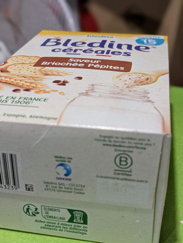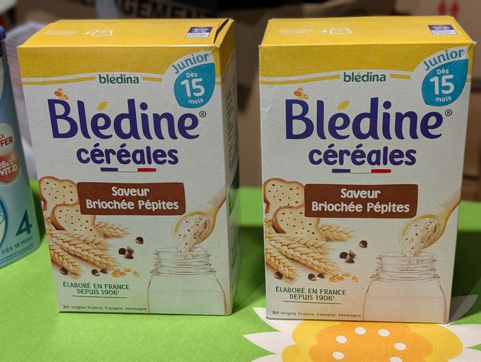 Une boîte et demie de céréales à mélanger avec le lait de marque Bledina. La boîte entière n'a jamais été ouverte. L'autre est remplie à un peu plus de la moitié. La dlc est août 2026 (pour les deux) Conseillé pour les plus de 15 mois. Saveur briochée pépites de chocolat. Envoi rapide.