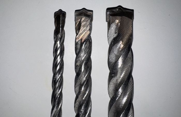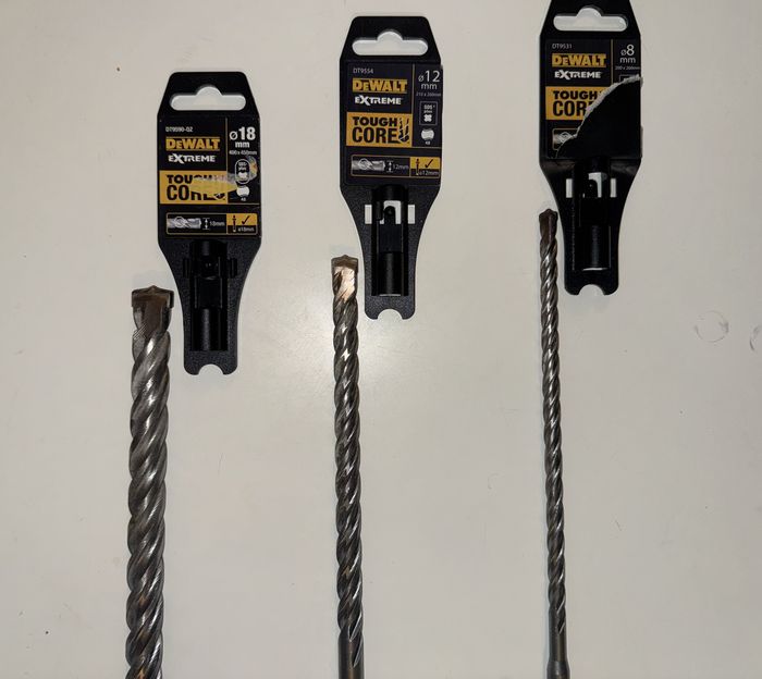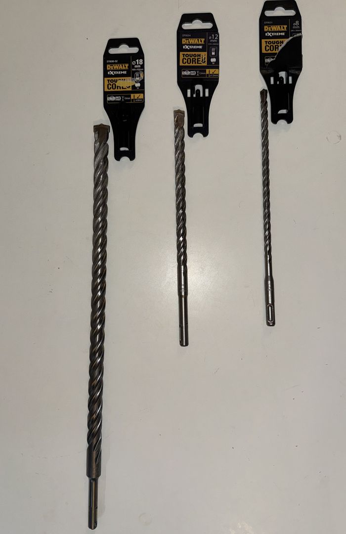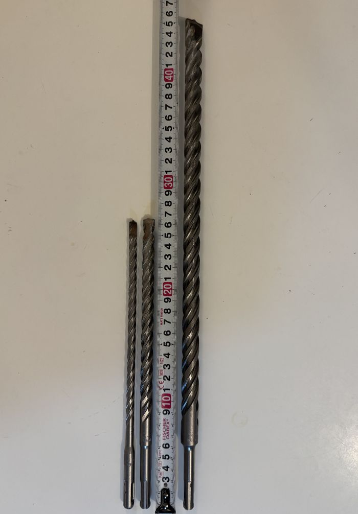 -1 Foret béton Ø8mm - 260mm long -1 Foret béton Ø12mm - 260mm long -1 Foret béton Ø18mm - 450mm long Forets comme neufs, utilisés une seule fois pour installer deux tuyaux d'eau à travers le mur.