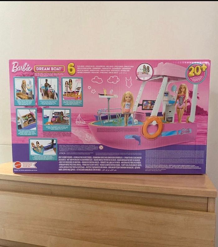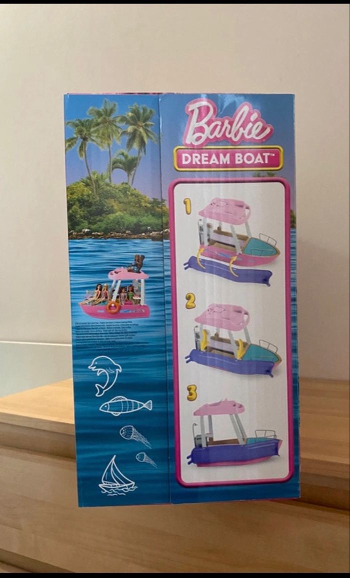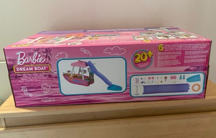 « dream boat » bâteau de rêve toboggan barbie neuf - jamais ouvert - en parfait état envoyé bien protégé Six espaces de jeu, y compris une salle de bain, un solarium, une piscine avec toboggan, une chambre, une cuisine et un salon Quelques secondes suffisent pour transformer le salon et la cuisine en chambre et en salle de bain Ce bateau Barbie inclut plus de 20 éléments Il y a des accessoires aquatiques, tels que des palmes et un tuba, ainsi que d'autres petits objets amusants, comme une caméra sous-marine, de la nourriture, des boissons, et même une enceinte portable Un chiot et un dauphin feront d'excellents compagnons pour explorer les mers avec