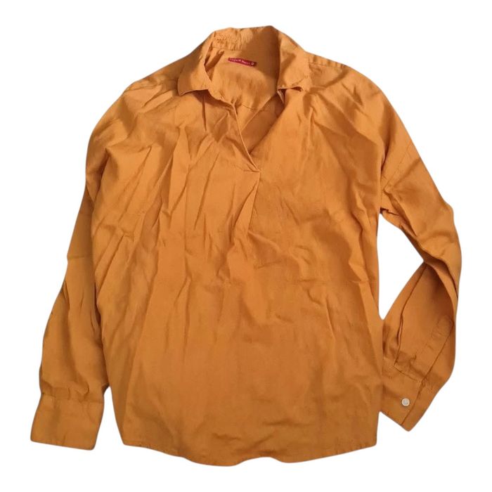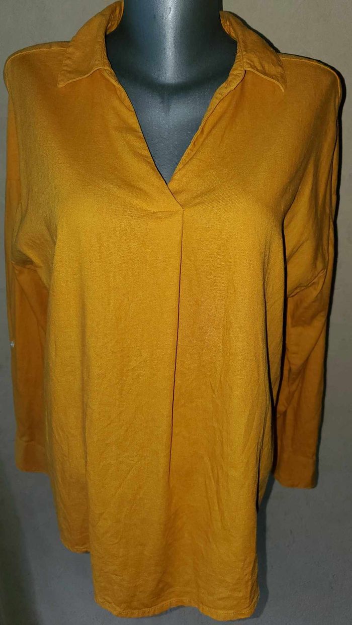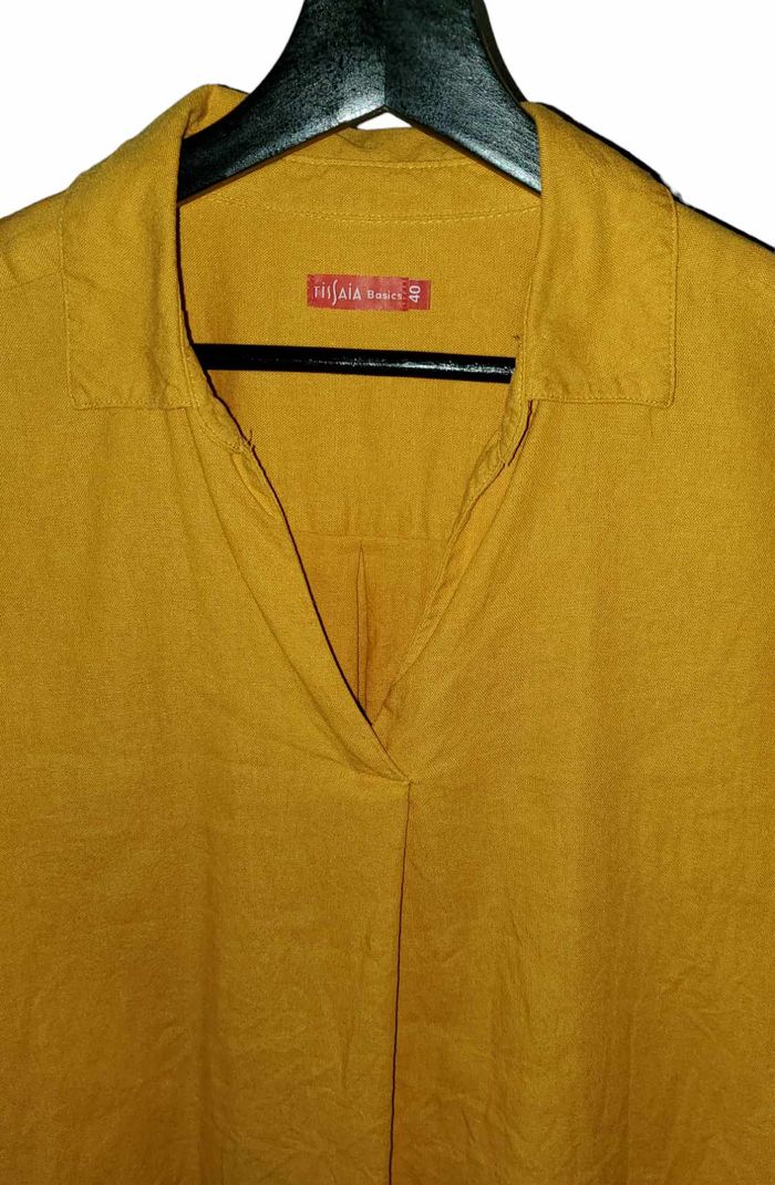 TISSAIA lin / viscose matière légèrement épaisse tons ocre / moutarde manches réglables par boutons bas arrondi longueur avant 67cm longueur arrière 75cm longueur manches 51cm épaules 65cm #lesplacardsenfolietaille40 #taille40 ref9