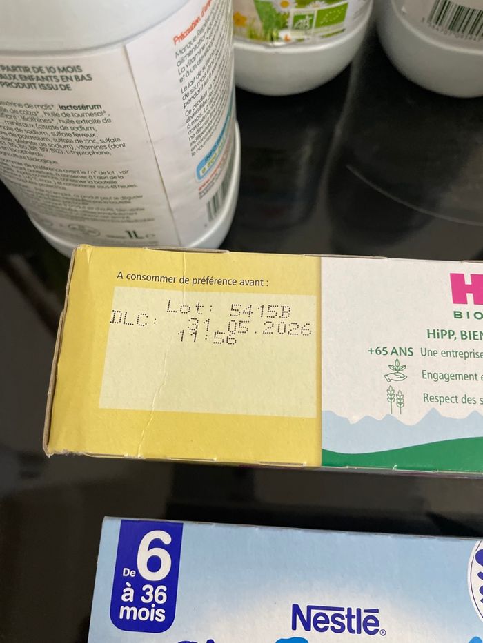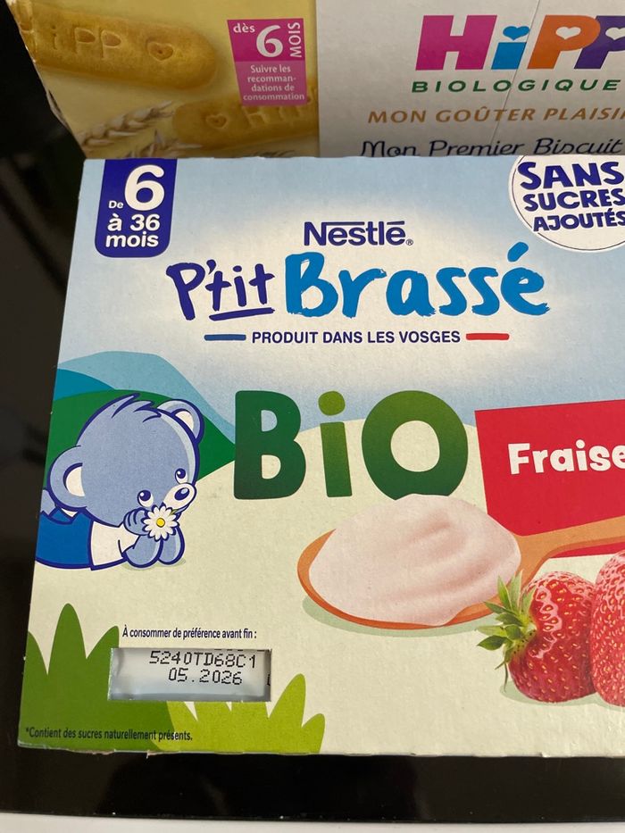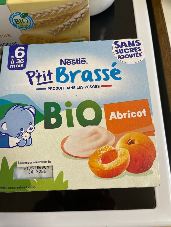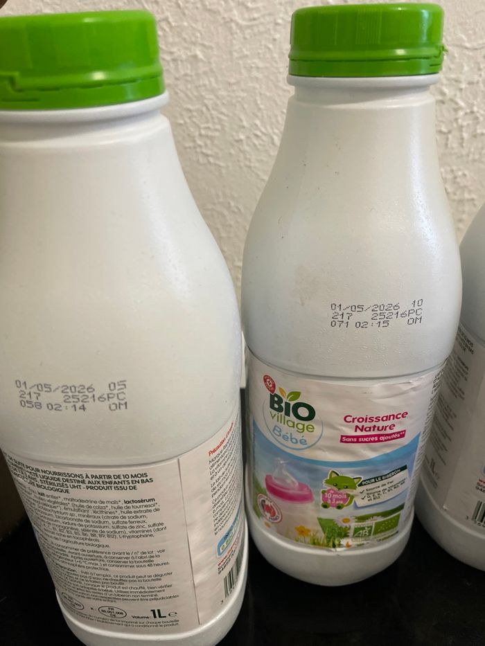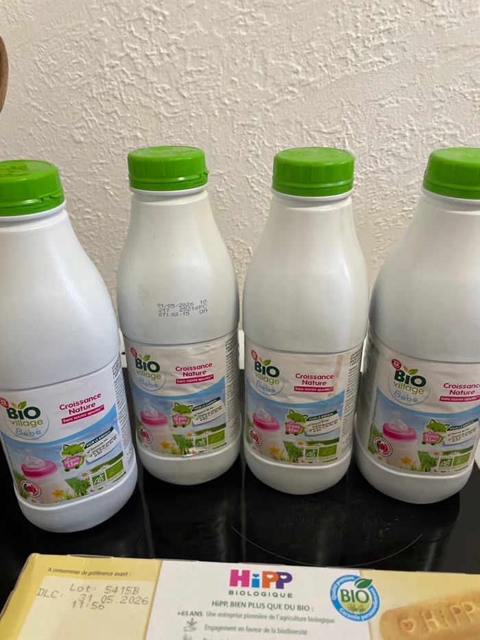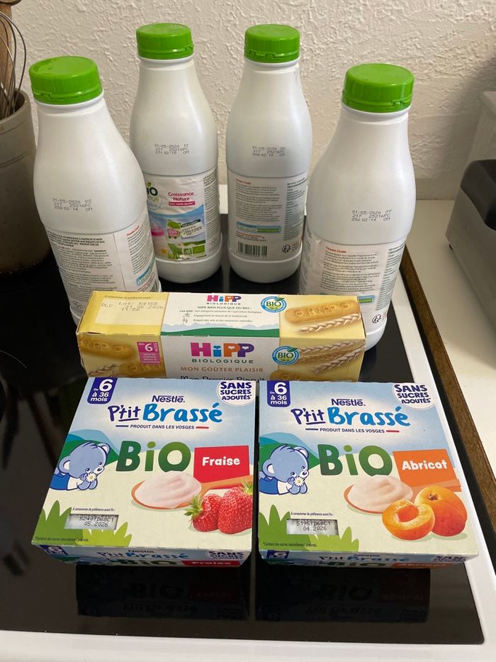 Ce lot contient 4 bouteilles de 1L de lait croissance nature Bio village bébé de 10 mois à 3 ans, 2 pack de yaourt Nestlé p’tit brassé abricot et fraise de 6 à 36 mois et 1 paquet de biscuits Hipp Biologique dés 6 mois.