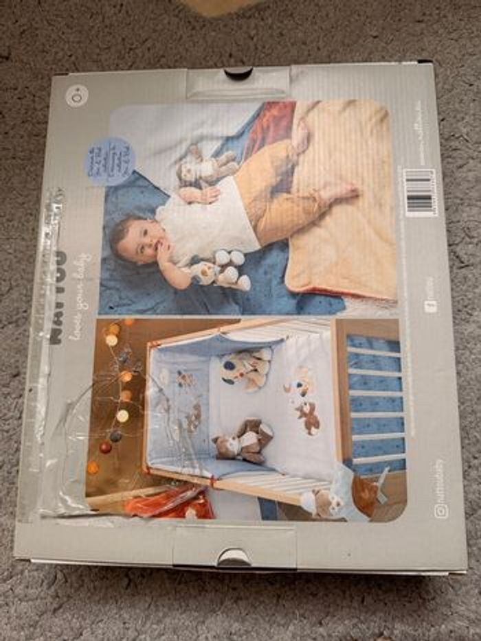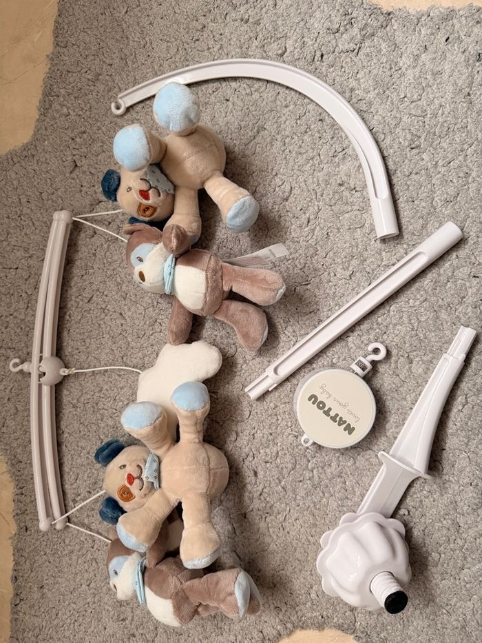 Mobile musical pour bébé de la marque Nattou, collection Jim & Bob. Parfait pour apaiser et éveiller bébé dès la naissance grâce à sa douce mélodie et ses personnages en peluche aux tons neutres et apaisants. Le mobile comprend plusieurs petites peluches (oursons/animaux) suspendues ainsi qu’un nuage, idéales pour stimuler la vue et rassurer bébé. S’installe facilement au-dessus d’un lit ou d’un berceau (support non visible sur les photos, conforme au modèle d’origine). État : très bon état. Peluches propres et bien conservées. Boîte d’origine fournie (boîte présentant quelques marques de stockage visibles sur les photos). Article vendu tel que présenté sur les photos. Envoi rapide et protégé. D’autres photos sur demande. #mobilebebe #nattou #jimetbob #mobilenursery #naissance #chambrebebe #cadeaunaissance #puériculture #decobebe