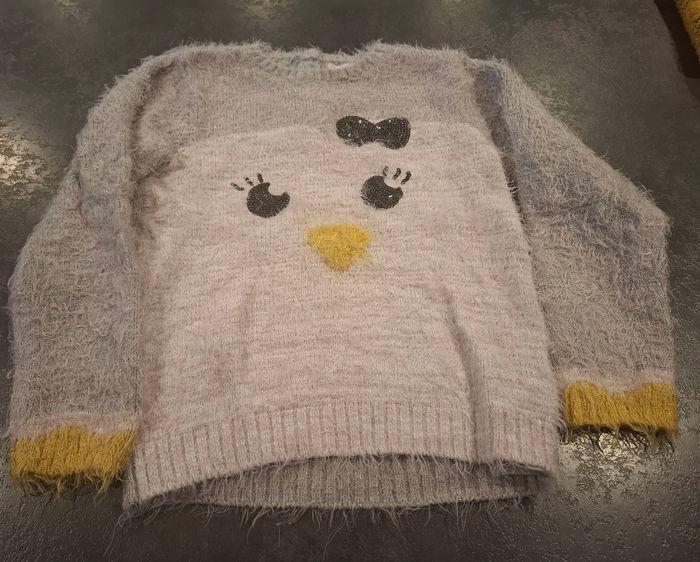 Adorable pull enfant avec un motif chouette sur le devant 🦉 Pull tout doux, effet légèrement duveteux, très agréable à porter. Coloris : gris clair, blanc et touches de jaune Manches longues avec finitions jaunes Style cosy et original, parfait pour l’automne/hiver ❄️ ✔️ Bon état ✔️ Chaud et confortable Taille : 4 ans 📦 Envoi rapide et soigné 🏠 Maison non-fumeur