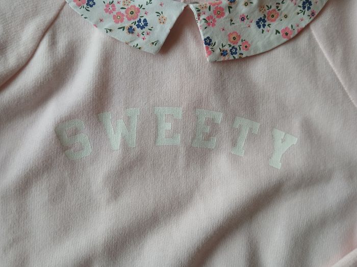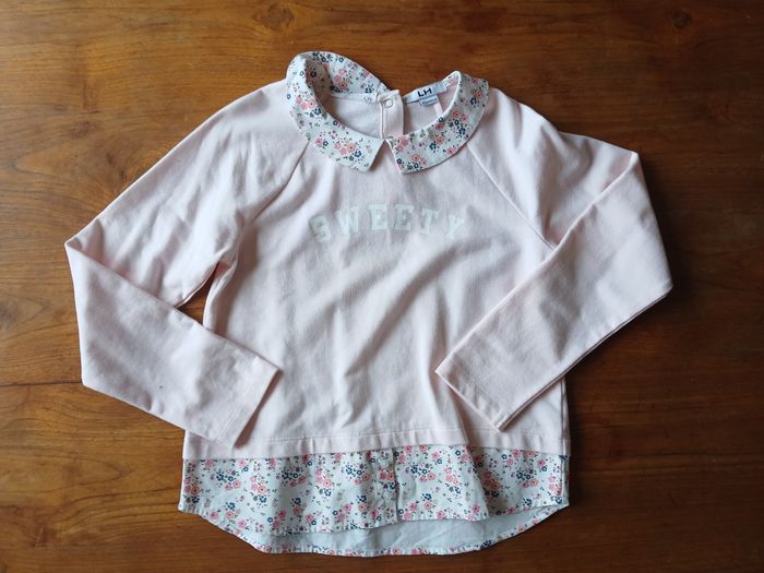 Sweat rose pale marqué "Sweety", col et bas genre chemise blanche a fleurs Taille 10 ans / 140 cm Marque La Halle Bon état, une petite tâche a l'arrière