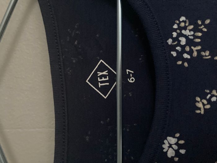 Robe de type tunique de la marque Tex, en taille 6-7 ans. Bleu marine avec motifs fleuris blancs et beiges sur l'ensemble du vêtement. Jolis détails de volants au niveau des épaules. L'article est en très bon état. #Worryfree_6ans #Tex #RobeFille #Tunique #6ans #7ans #BleuMarine #Fleurs #ModeEnfant #TresBonEtat