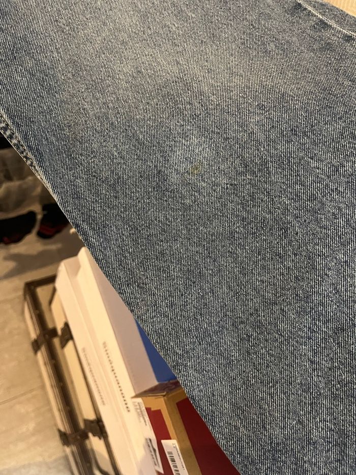 Neuf : lavé 1 fois et jamais porté, je l’ai racheté dans une autre taille. Valeur magasin : 22€ Acheté comme tel avec la petite tache incrusté dans le jean au niveau du bas de la jambe, voir photo Jean taille haute, ample et patte def’