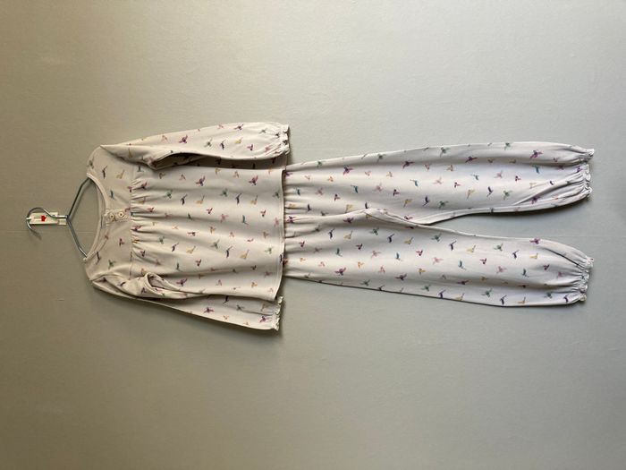 Pyjama deux pièces de la marque Petit Bateau, en taille 6 ans (116 cm). Motifs d'oiseaux colorés. Le pyjama a bien été porté, il reste tout à fait fonctionnel et confortable, idéal comme pyjama de rechange ou pour les nuits chez les grands-parents par exemple. #Worryfree_6ans #PetitBateau #PyjamaFille #6ans #116cm #Oiseaux #ModeEnfant