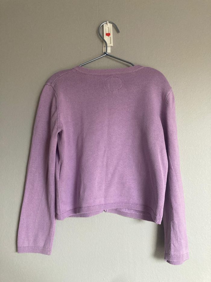 Joli gilet de la marque Sergent Major, en taille 6 ans (116 cm). Il est d'une belle couleur lilas/mauve, avec des détails délicats de trèfles ajourés sur le devant. L'article est en très bon état. #Worryfree_6ans #SergentMajor #GiletFille #Lilas #6ans #116cm #ModeEnfant #Trèfles #Cardigan #TresBonEtat