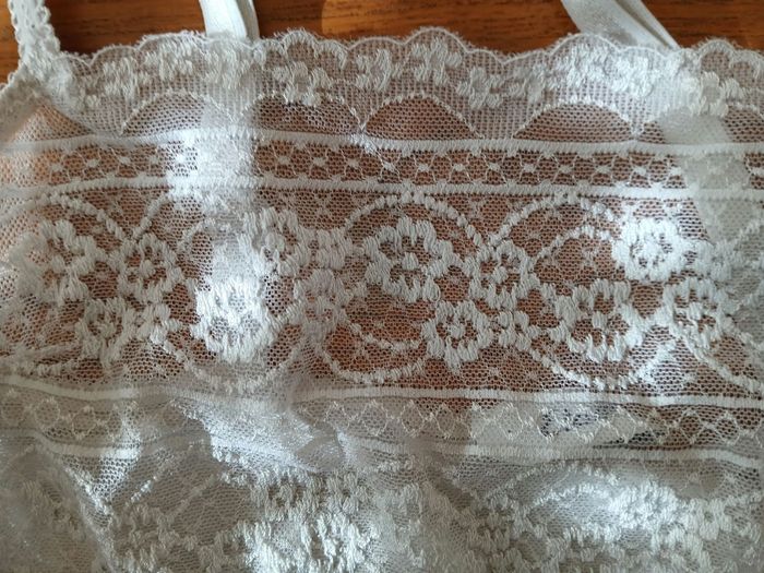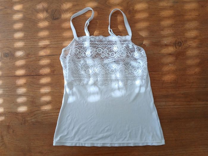 Debardeur blanc en synthétique de la marque Etam. Bandeau de dentelle sur la poitrine. Bretelles réglables. Etiquettes coupees mais correspond a une taille S Très bon état