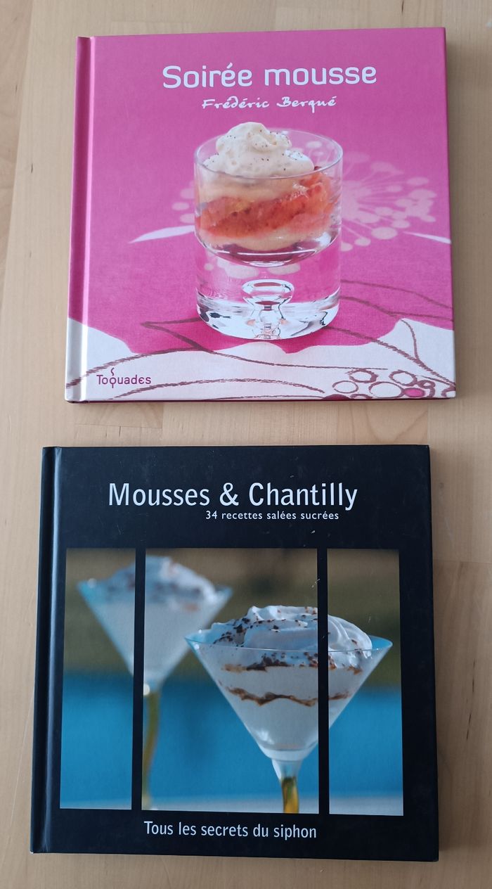 Bonjour, Vends un lot de 2 livres de cuisine / recettes : Soirée mousse Mousses et chantilly Très bon état