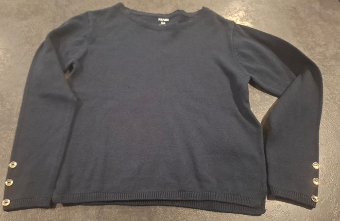 Pull fille KIABI, couleur bleu marine, style sobre et élégant. Détails boutons dorés au bas des manches qui apportent une touche chic ✨ Manches longues Col rond Maille douce et confortable ✔️ Très bon état ✔️ Facile à assortir, idéal pour l’école Taille : 5 ans 📦 Envoi rapide et soigné 🏠 Maison non-fumeur