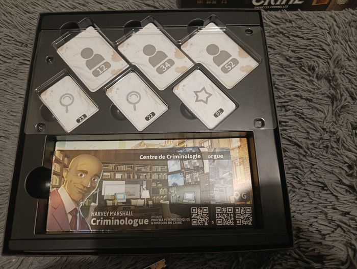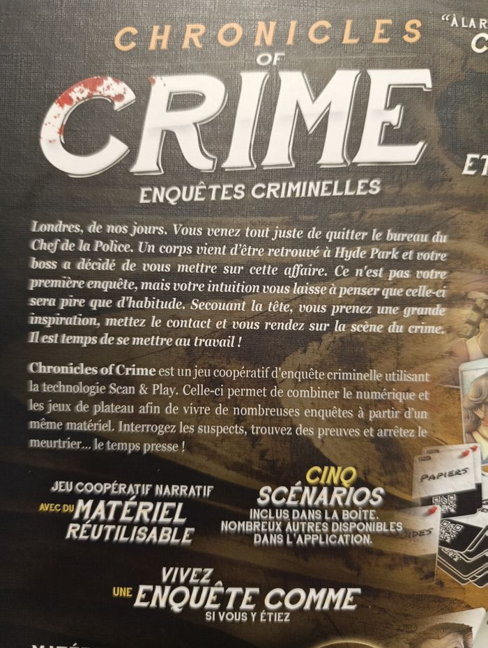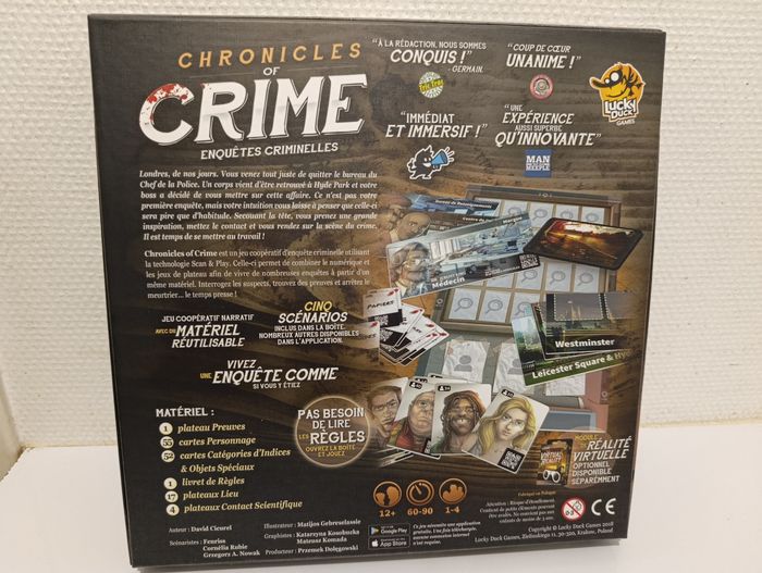 Neuf sans blister jamais servi Chronicles of Crime est un jeu coopératif d'enquête criminelle combinant un jeu de société, une application et une touche de réalité virtuelle. Vous et votre équipe serez placés dans des affaires criminelles, vous vous déplacerez dans toute la ville, interrogerez des suspects ou des témoins et vous chercherez des indices dans des scènes en 3D! - 1 tutorial - 5 scenarios - 40 cartes personnages - 35 cartes de catégories d’indices - 10 cartes d’indices spéciaux - 12 plateaux de lieu - 4 plateaux de contacts scientifiques - 1 plateau - 1 livre de règle