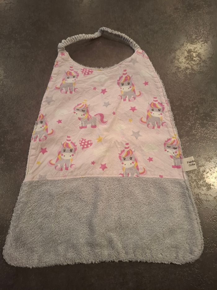 Joli bavoir enfant avec de adorables motifs licornes, étoiles et cœurs 🦄✨ Partie basse en éponge grise bien absorbante, idéale pour les repas. Attache élastique pour un enfilage facile Doux et confortable Pratique pour la maison ou la crèche Marque : Panda Créa (fait main ) 📦 Envoi rapide et soigné 🏠 Maison non-fumeur