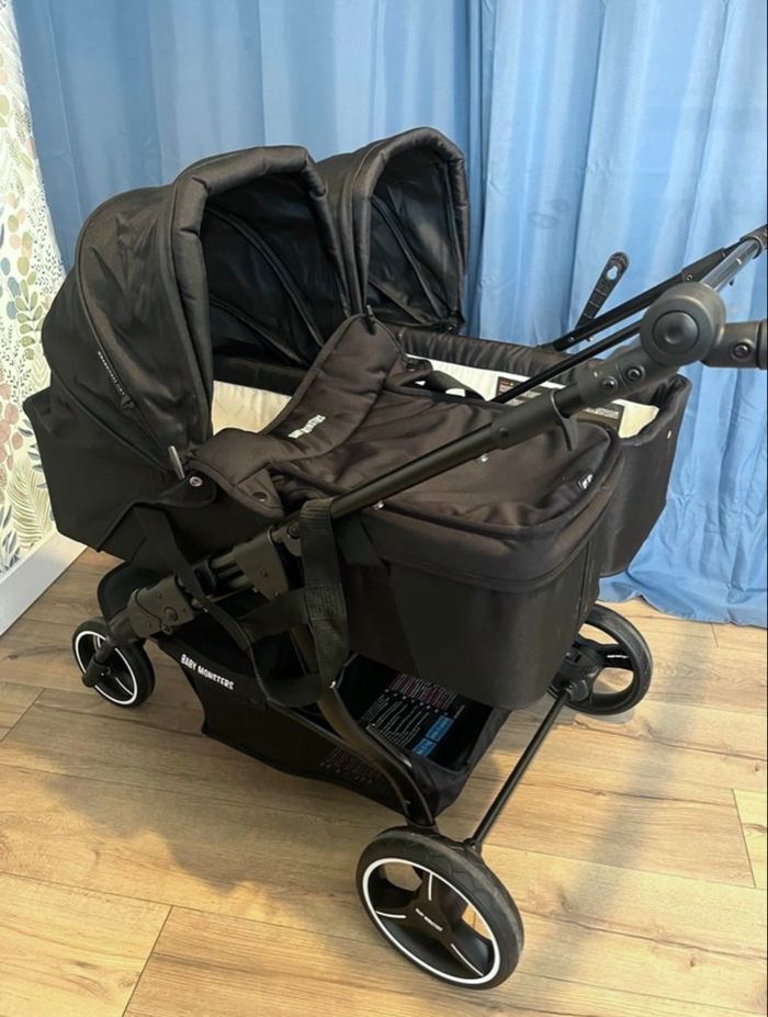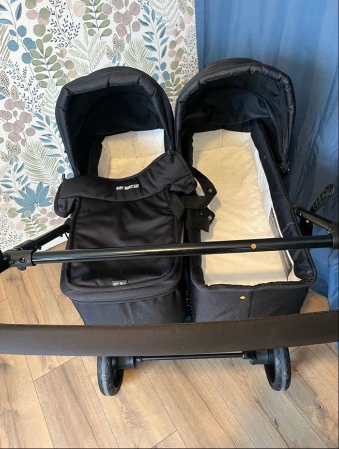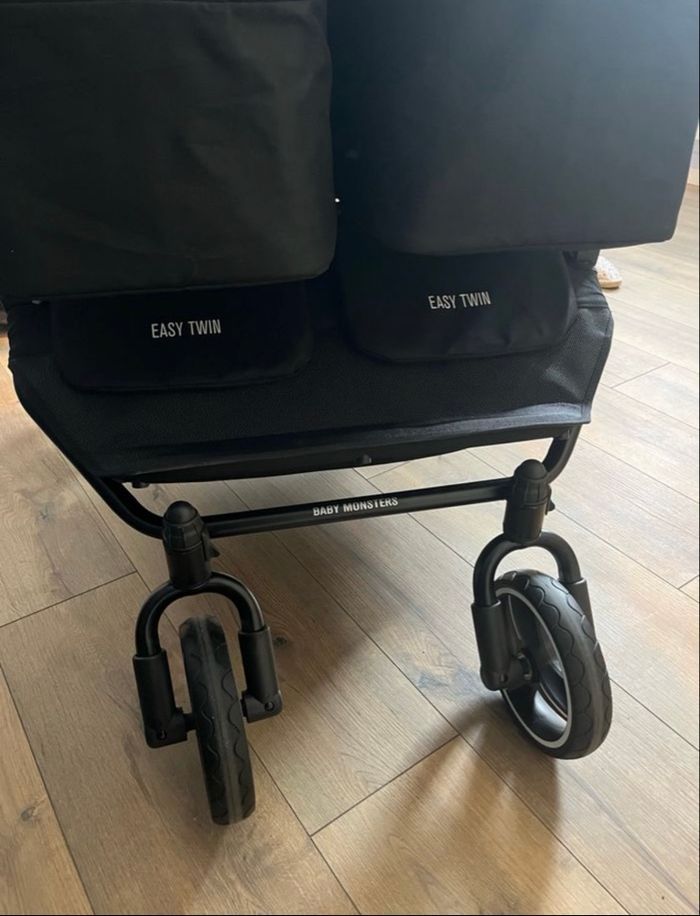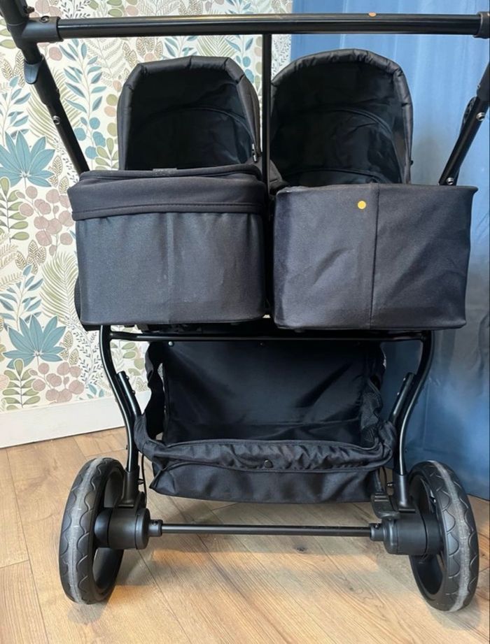 À vendre poussette double neuve. Vendu avec deux nacelle et adaptateur cosy. Deux assises et canoply noir + bleu. Habillage de pluie et canoply xxl. Norme handicapé, taille d’un fauteuil roulant, passe partout. Compacte une fois plié.