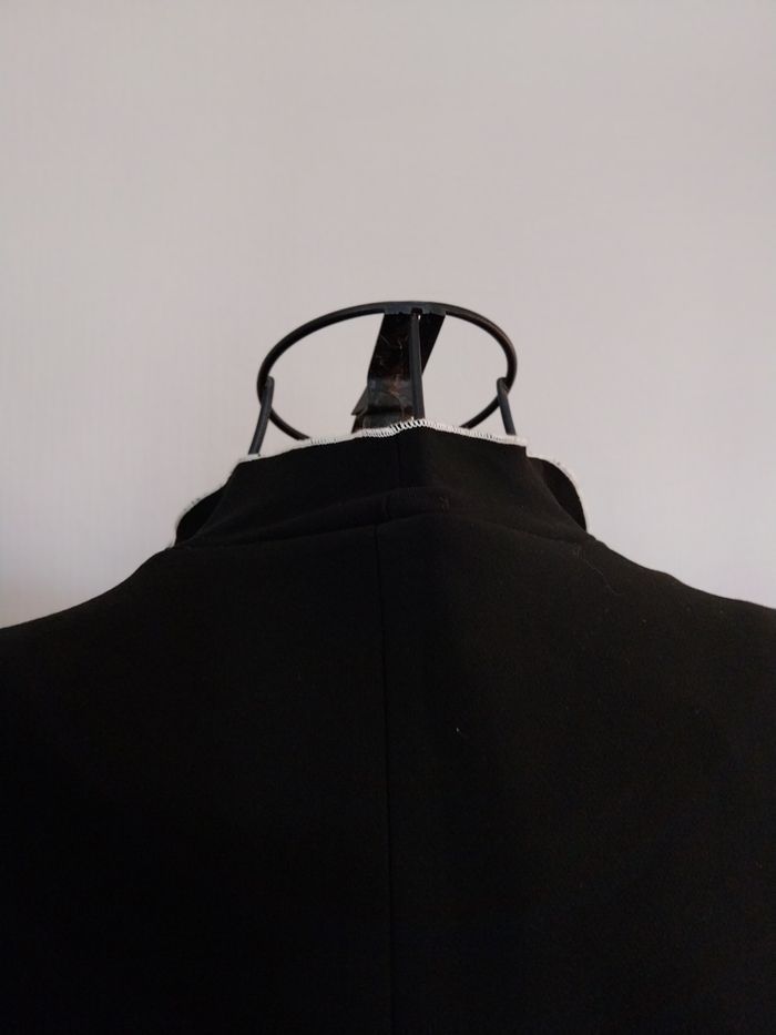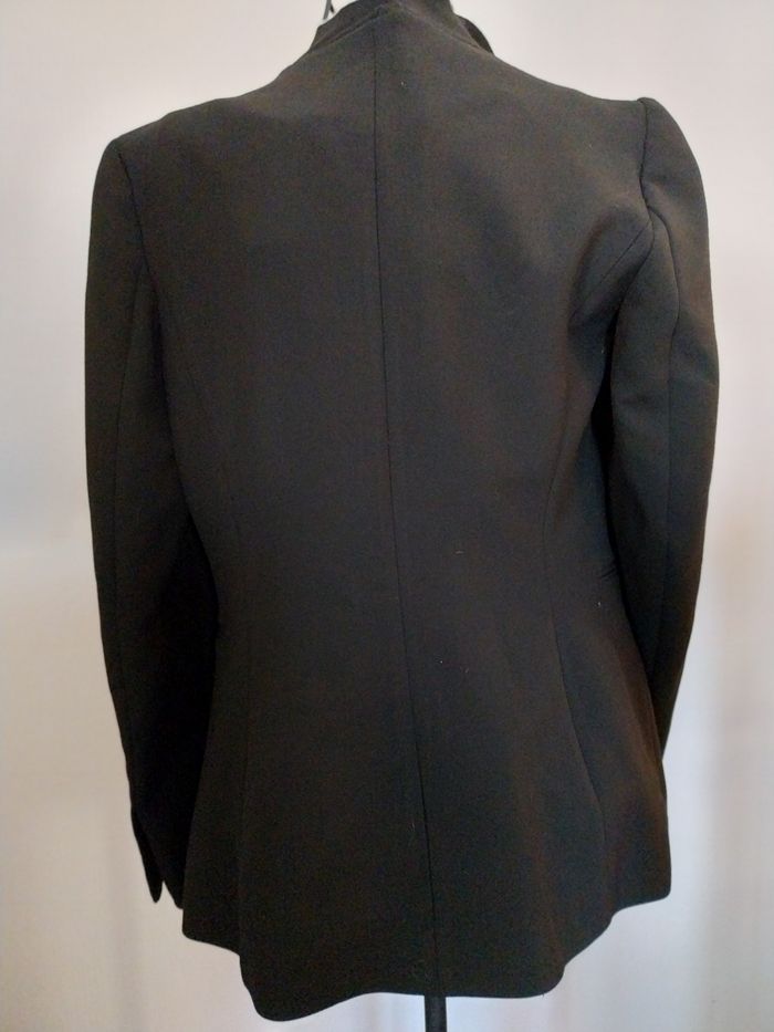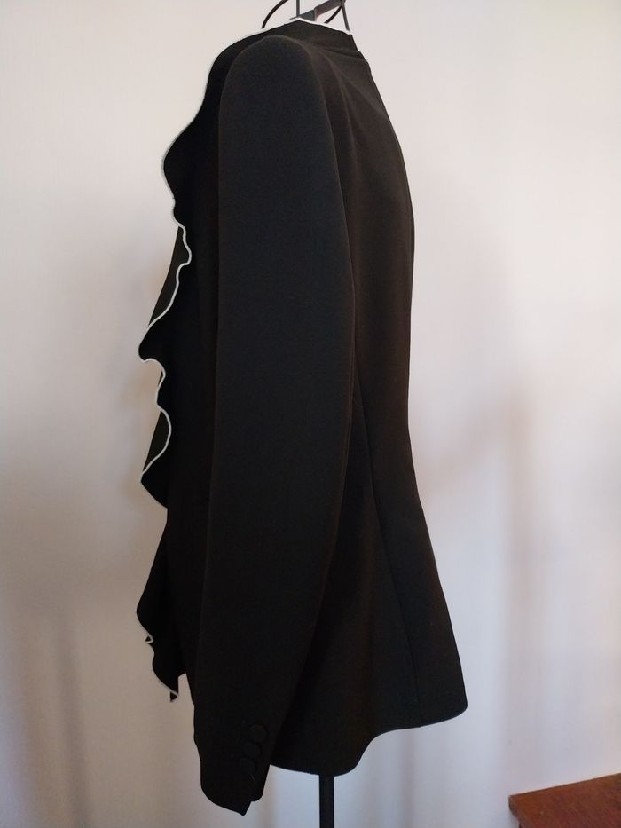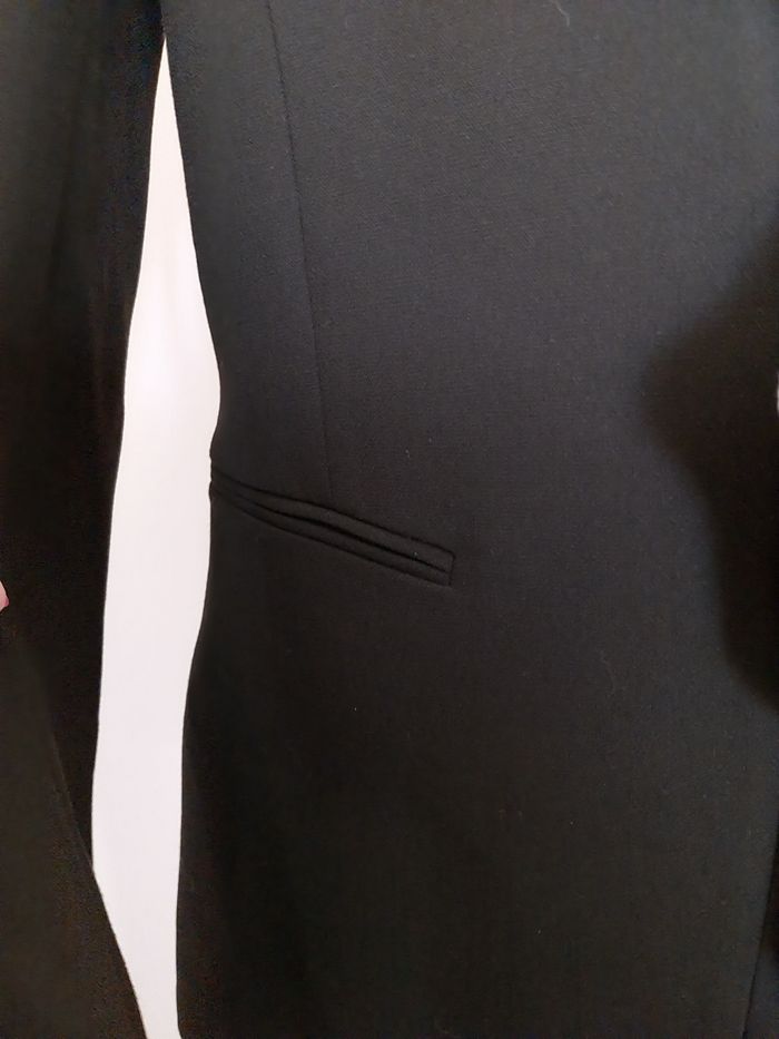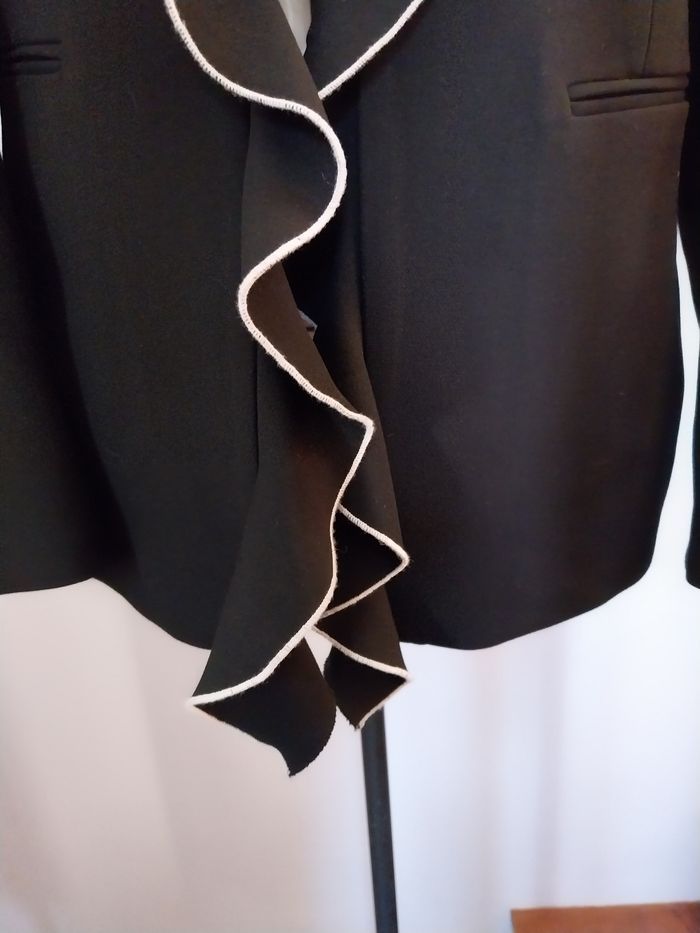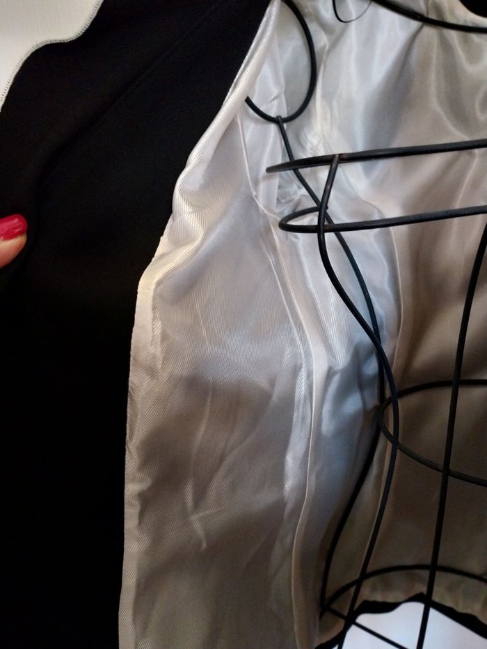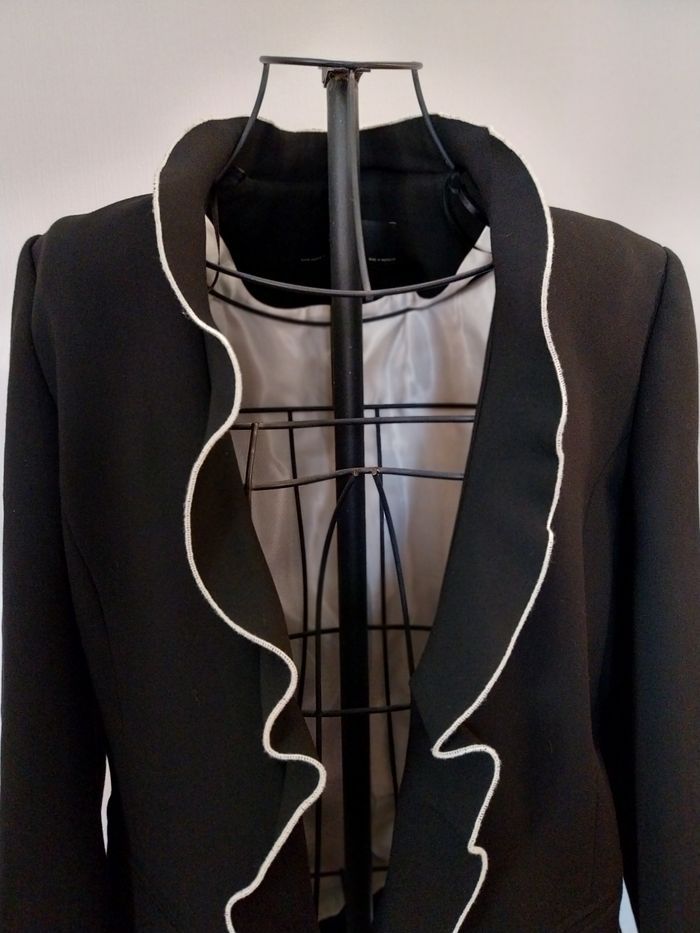 Entièrement doublée en acétate Dessus : 49 % polyester , 48 % viscose et 3% élasthanne Fausses poches Jolis boutons au bout des manches recouverts de tissu ( ils sont déboutonnables) Col forme frou-frou bordé par une couture blanc cassé C'est une veste très classe