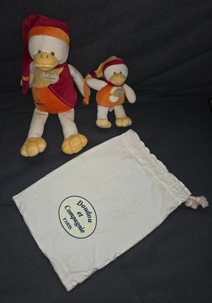 Doudou et compagnie peluches canard Gedeon en velours de couleur jaune , orange et rouge. Canard qui mesure 29 cm env et petit canard qui mesure 16 cm env
