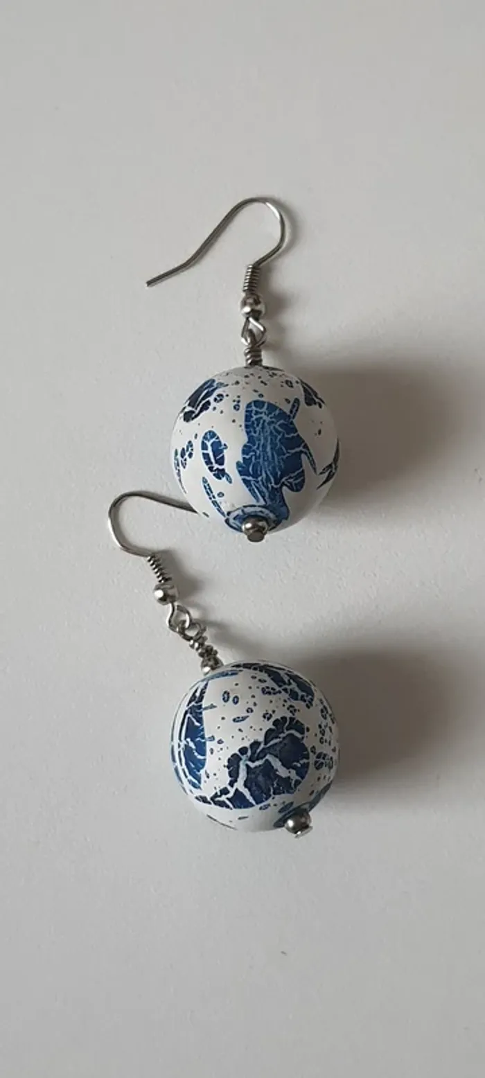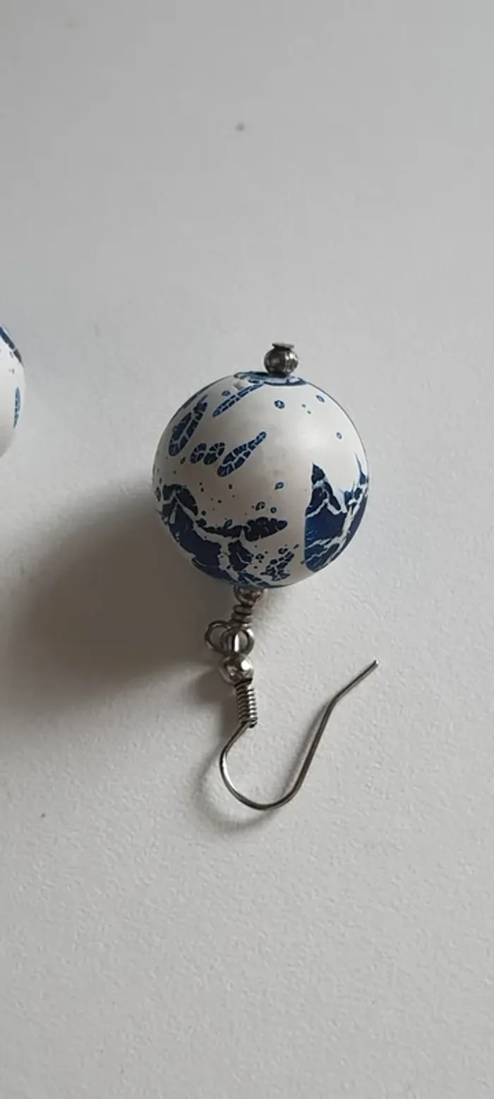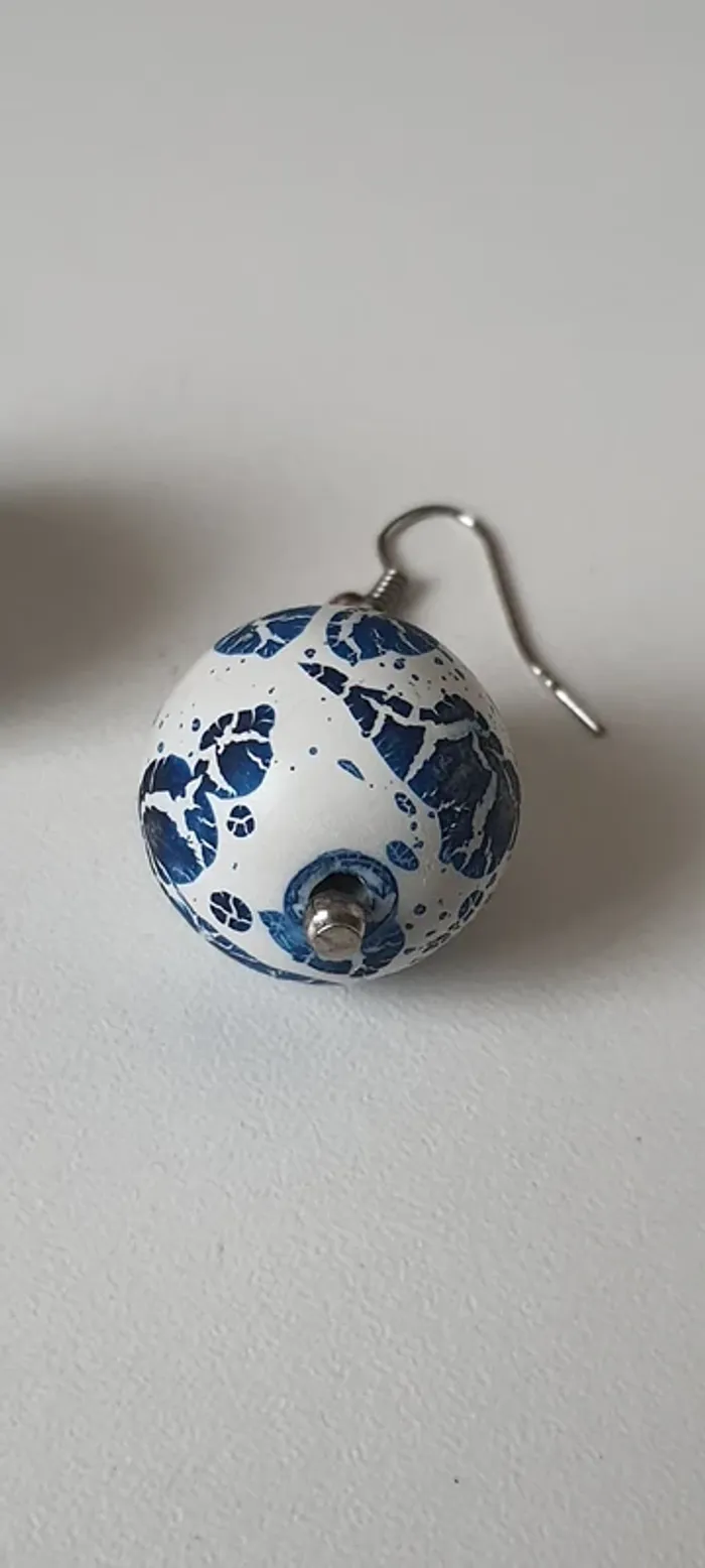 Boucle d'oreille fantaisie boule Bleu et blanc, diamètre 2 cm.