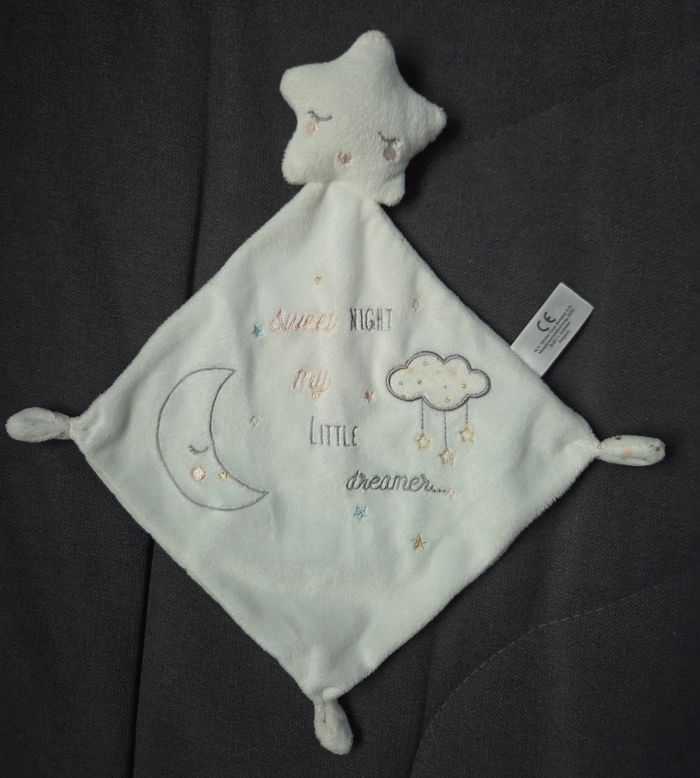 Doudou plat losange etoile dormeuse en velours de couleur blanche avec mouchoir en velours de couleur blanc et de l'autre côté en velours de couleur blanc avec étoiles dorés, grises et saumons Motifs brodés sur le mouchoir : 1 Lune et 1 nuage avec écriture " Sweet night my Little dreamer ..."