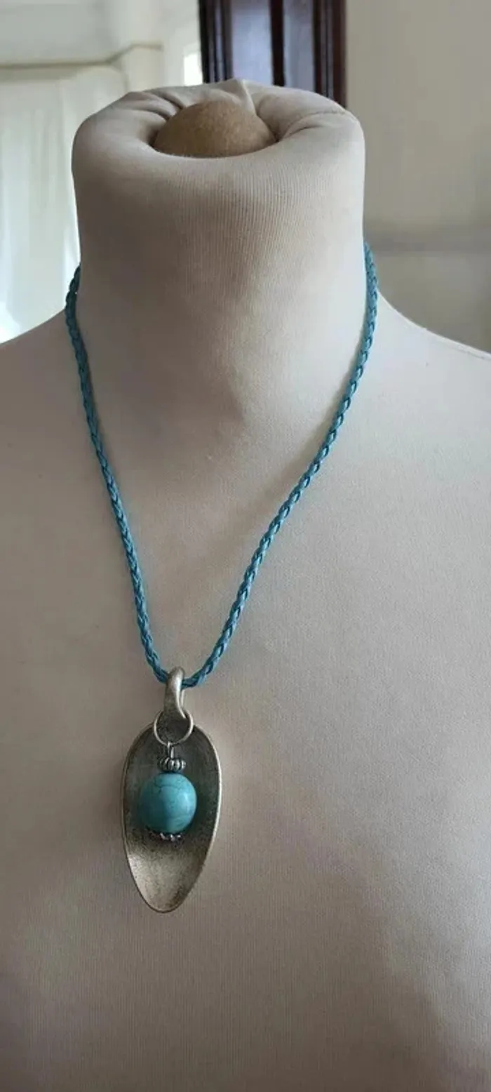 Collier fantaisie boule bleu dans une cuillère en argent (poinçon) Dimension: longueur 46 cm.