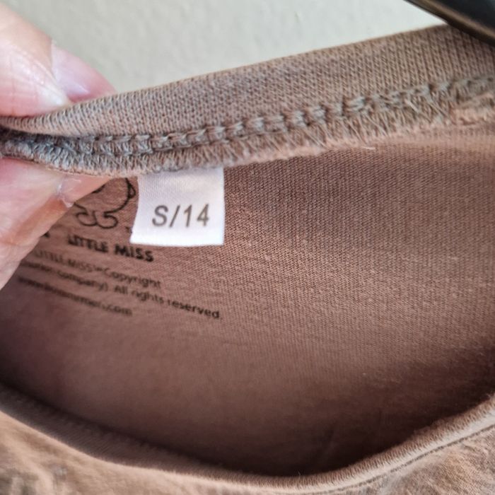 💐Négociation acceptée sur lot💐 Tee shirt kaki marron Parfait etat Indique blah blah blah En relief perlé rose Taille 14 ans S