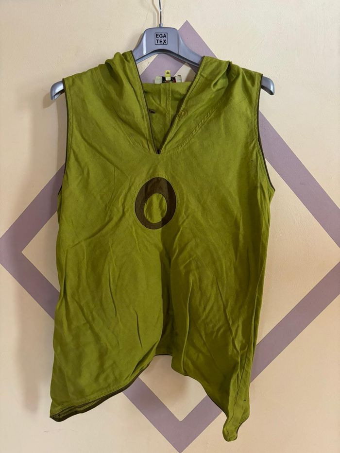 Débardeur vert avec une capuche derrière en très bon état. Taille : XL / 42 Sans marque particulière N'hésitez pas a aller voir sur mon profil si d'autres annonces peuvent vous intéresser !