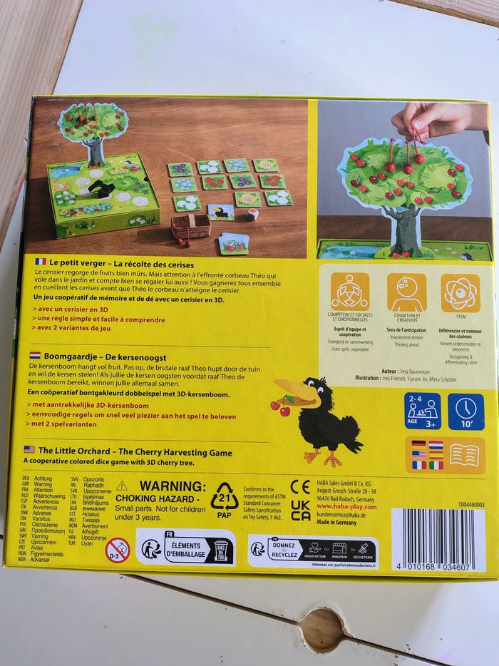 Jeu Haba Le petit Verger (ref 06022089) Jeu en état neuf (doublon) Description du jeu : Les enfants viennent faire la cueillette des cerises. Mais l'effronté corbeau vole aux alentours. Le dé indique quelles plaquettes fleurs retourner. Chaque plaquette indique soit une cerise (les enfants en récoltent une), le corbeau (mince, il avance !) ou un animal endormi (on passe son tour). Les enfants vont-ils pouvoir récupérer toutes les cerises avant que le corbeau n'atteigne l'arbre ? Un jeu coopératif de dé et de mémoire.
