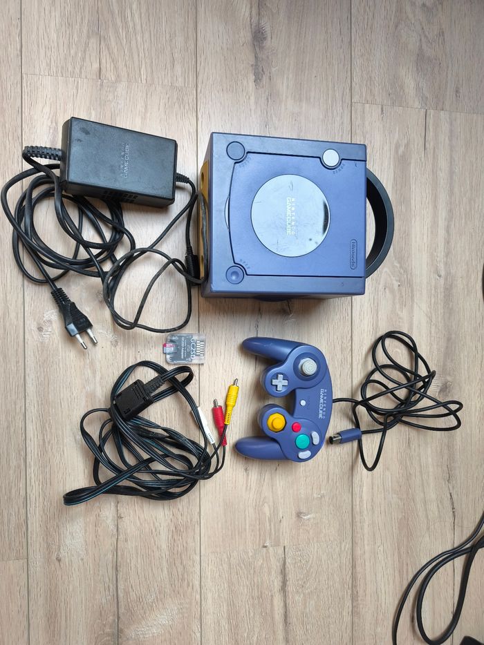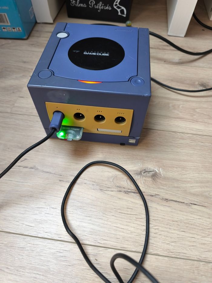 Console gamecube picoboot complète. Console avec modchip picoboot permettant la customisation de la console. État satisfaisant extérieur.( Coque jaunie, coups, tâches). Lecteur ok, manette ok