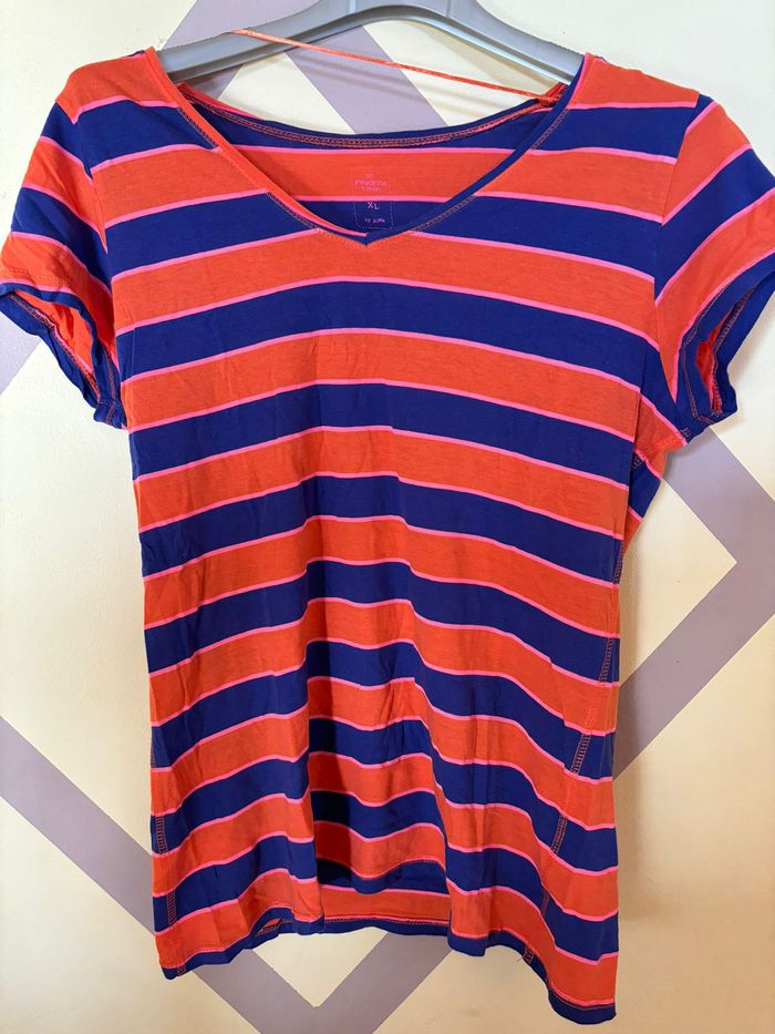 Tee-shirt rayé bleu et corail en très bon état Taille : XL / 42 Marque : Kiabi N'hésitez pas a aller voir sur mon profil si d'autres annonces peuvent vous intéresser !