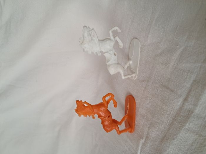 Lot de 2 figurines en plastique cheval blanc cheval rouge ancien, vintage Hauteur : 7 cm Poids total : 15 grammes Etat satisfaisant Manque le queue sur le orange La queue du blanc est cassée