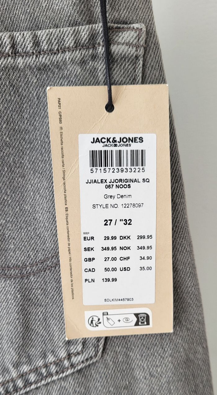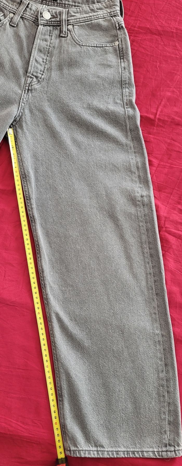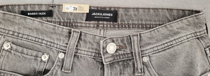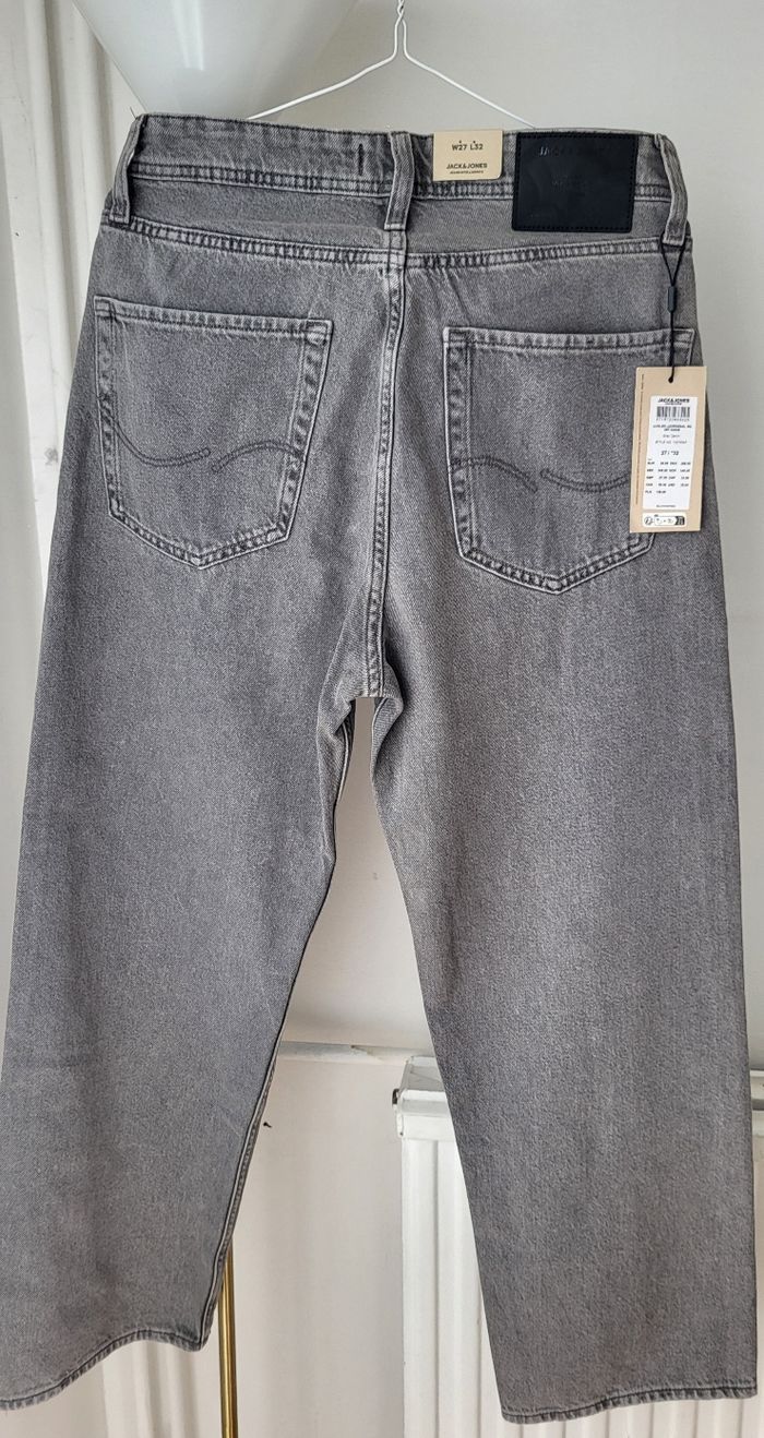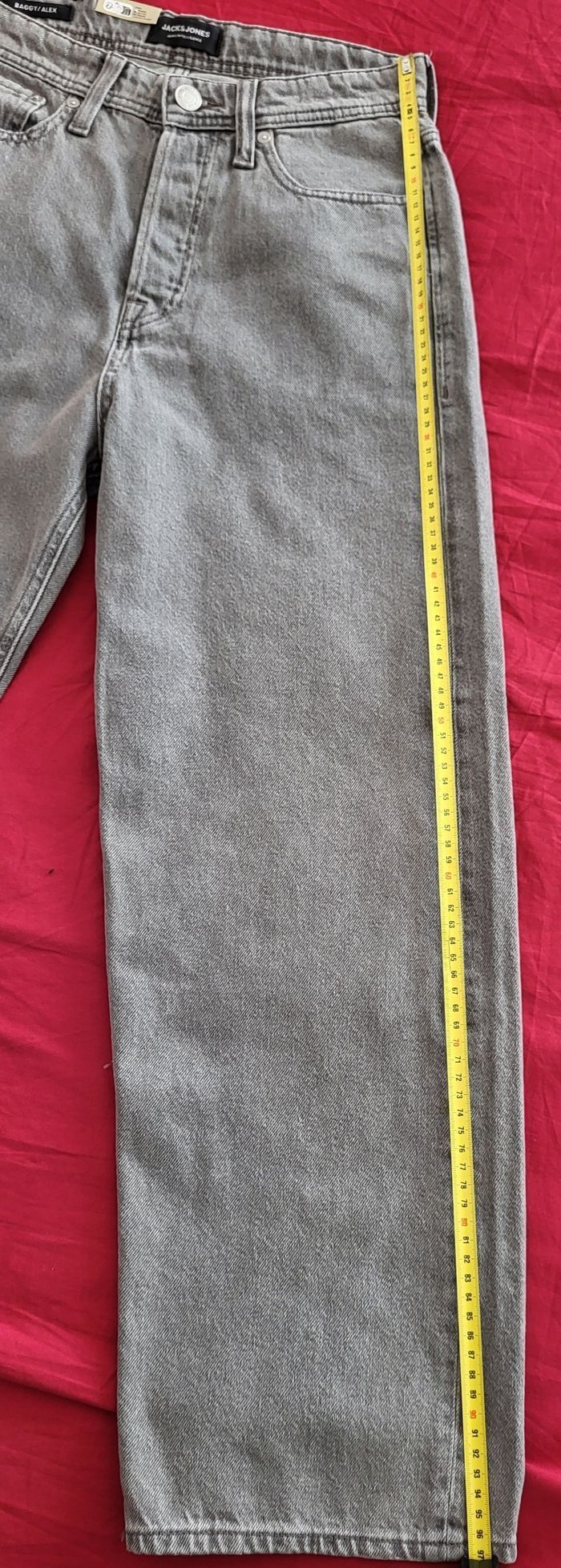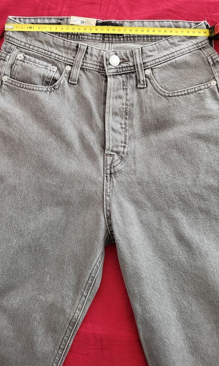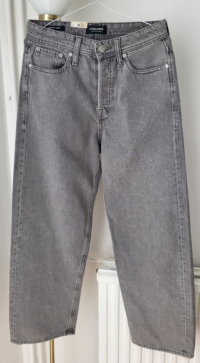 Vends jean baggy Alex JACK&JONES gris taille W27L32. Je le vends car trop court pour mon fils qui mesure 1m75.Au vu de la longueur de l'entrejambe, cela correspond plus à un L30. -Taille: 35 cm -Longueur: 97 cm -Longueur entrejambe: 65 cm -Largeur du bas: 21 cm Neuf avec étiquette. Envoi rapide.