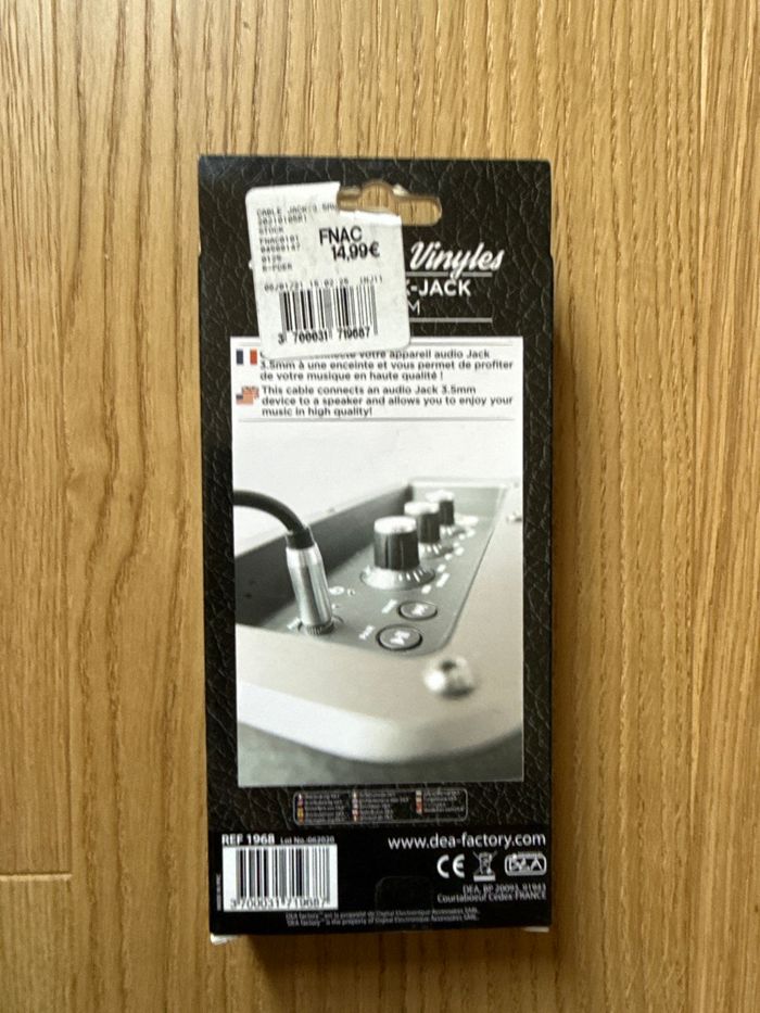 Câble audio jack 3,5 mm / jack 3,5 mm, longueur 1,5 m. Modèle premium avec connecteurs en aluminium. Idéal pour relier smartphone, ordinateur, platine, ampli ou enceinte compatible. Exemplaire neuf, jamais utilisé. Envoi rapide et soigné. Remise en main propre possible sur Paris 3. N’hésitez pas si vous avez des questions