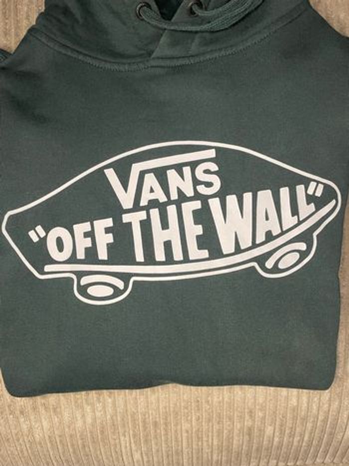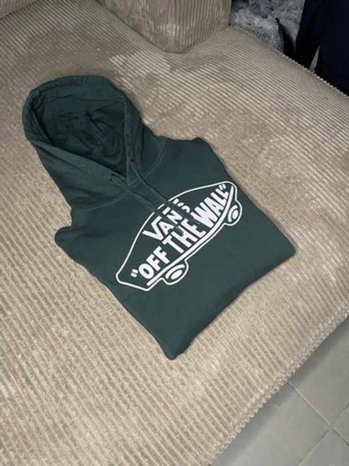 Sweat à capuche Vans vert foncé avec logo “Off The Wall” blanc sur le devant. Modèle iconique de la marque, confortable et intemporel. 🔹 État : très bon état ➡️ L’article n’est pas neuf ➡️ Aucun défaut à signaler ➡️ Pas de taches, pas de trous, impression en excellent état 🔹 Détails : • Marque : Vans • Couleur : vert foncé • Capuche avec cordons • Poche kangourou • Intérieur molletonné, chaud et confortable • Taille : XS (voir étiquette) Parfait pour un style skate / streetwear au quotidien. 📦 Envoi rapide et soigné. 💬 N’hésite pas à me contacter pour toute question ou photo supplémentaire.