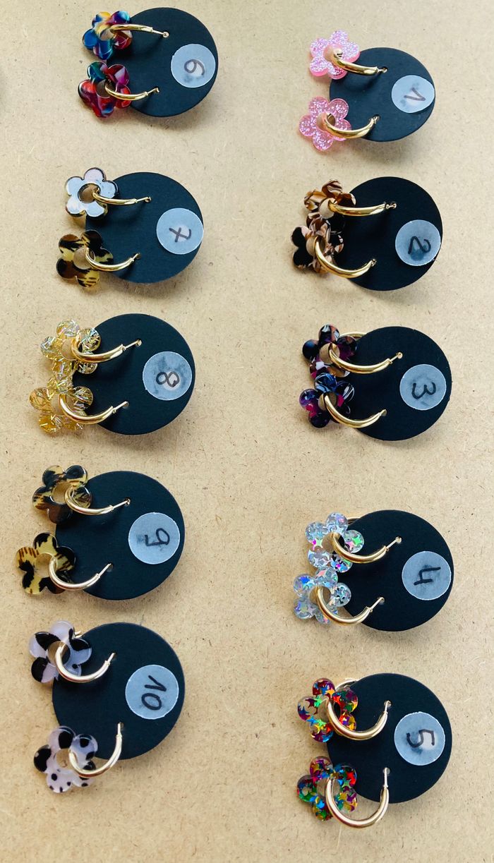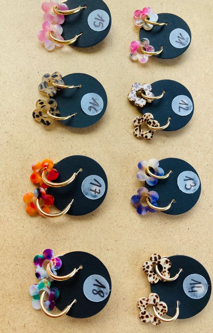 Boucles d’oreilles anneaux a fleur interchangeable, en résine. 3€ la paire (réduction ok en lot)