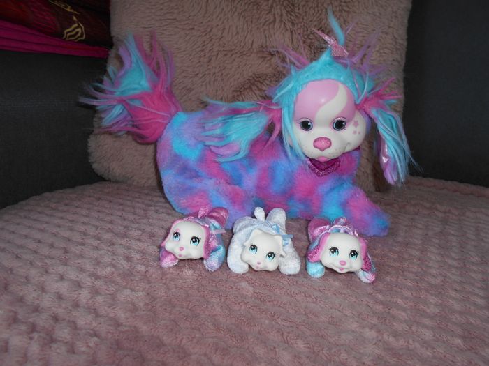 Vends cette peluche chiots surprise de la marque Puppy surprise: découvrez une portée de 3, 4 ou même 5 adorables chiots avec Puppy Surprise. Pour découvrir combien de chiots se trouvent à l'intérieur de la peluche, ouvrez le scratch sur son ventre et comptez les bébés. Les colliers roses indiquent des chiots filles, tandis que les colliers bleus indiquent des garçons. Cherry et sa famille ont une fourrure douce et câline: chacun avec d'adorables visages, une couleur individuelle, de la fourrure et des poses uniques. Les enfants s'amuseront à nommer chaque chiot en peluche, à s'occuper de la portée et à raconter de jolies histoires, en trés bon état.