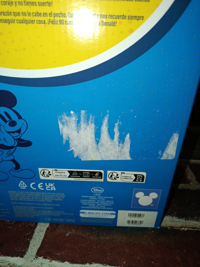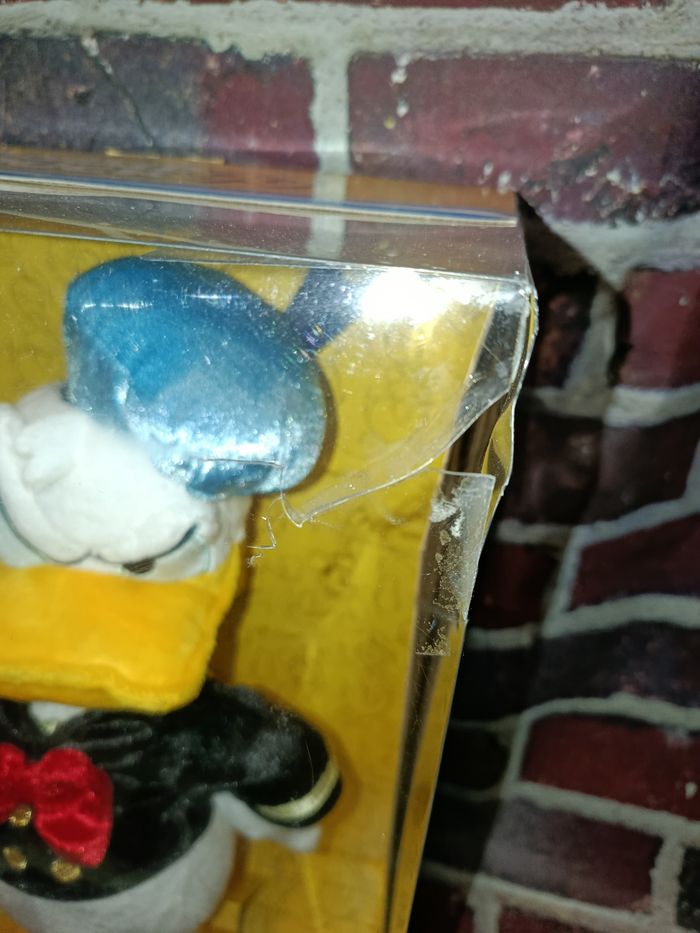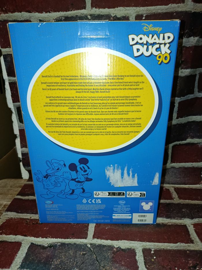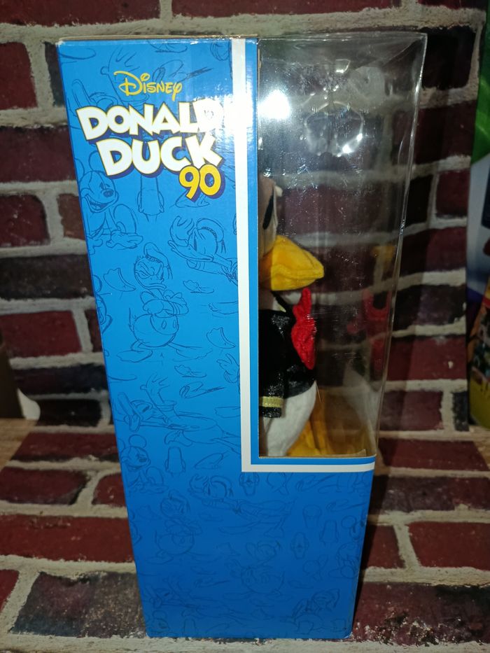 Peluche collector 90 ans de Donald Disney store, neuve non ouverte, la boîte est abîmée comme visible sur les photos.