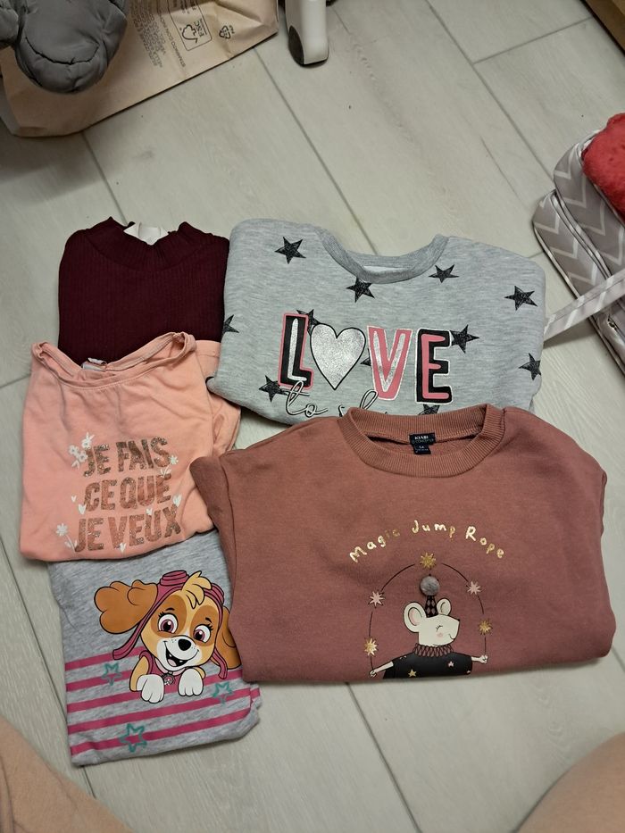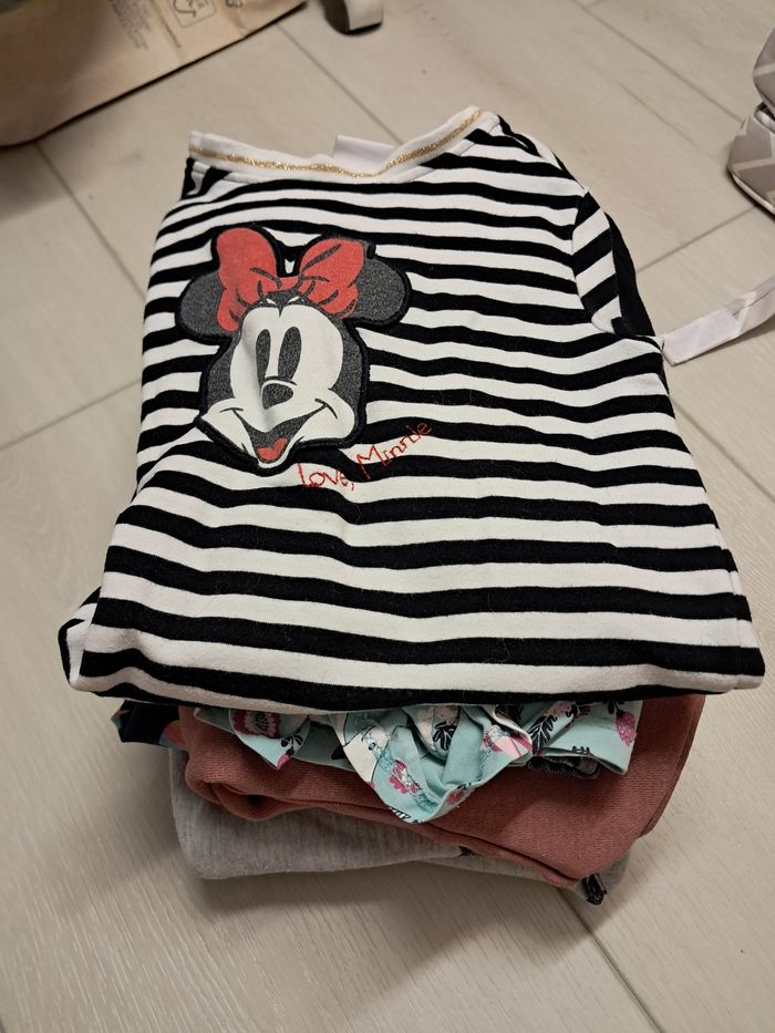 Lot vêtements fille taille 5 ans j'ai encore 3 t-shirts manche longue je peux pas mettre en photo me demande et je vous envoie les photos. 18 pièces sur la robe Minnie petite tâche et petit trou débardeur Minnie sinon très bonne état.