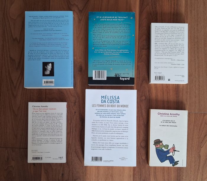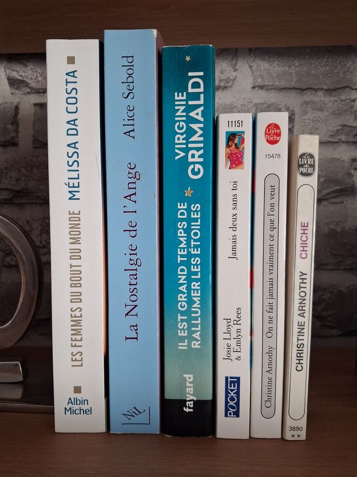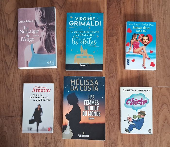 ✏️ La nostalgie de l’ange Alice Sebold NIL Editions Très bon état Prix éditeur : 16.80 € ✏️ Les femmes du bout du monde Mélissa Da Costa Edition Albin Michel Prix éditeur : 21,90€ Très bon état - marque manuscrite sur première page et couverture marquée au dos ✏️ Il est grand temps de rallumer les étoiles Virginie Grimaldi Edition Fayard Très bon état Prix éditeur : 20.90 € ✏️ Jamais deux sans toi Josie Lloyd & Emlyn Rees Edition Pocket Comme neuf ✏️ On ne fait jamais vraiment ce qu l’on veut Christine Arnothy Edition Le livre de poche Très bon état ✏️ Chiche (Offert pour l’achat du lot) Christine Arnothy Edition Le livre de poche Bon état - jauni Il s’agit de livres d’occasion, ils présentent donc des traces d’utilisation ou des marques sur les couvertures. N’hésitez pas à demander des photos supplémentaires en cas de besoin. Livraison acceptée Ou remise en main propre possible sur Paris (Bibliothèque François Mitterrand, Gare de Lyon), La Défense, Etampes, etc...
