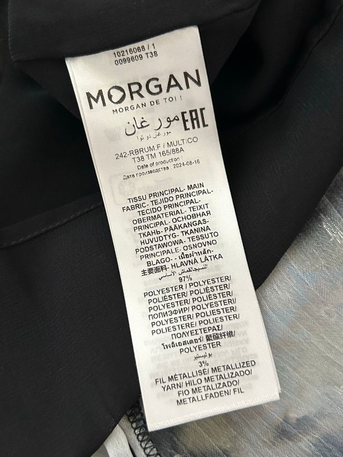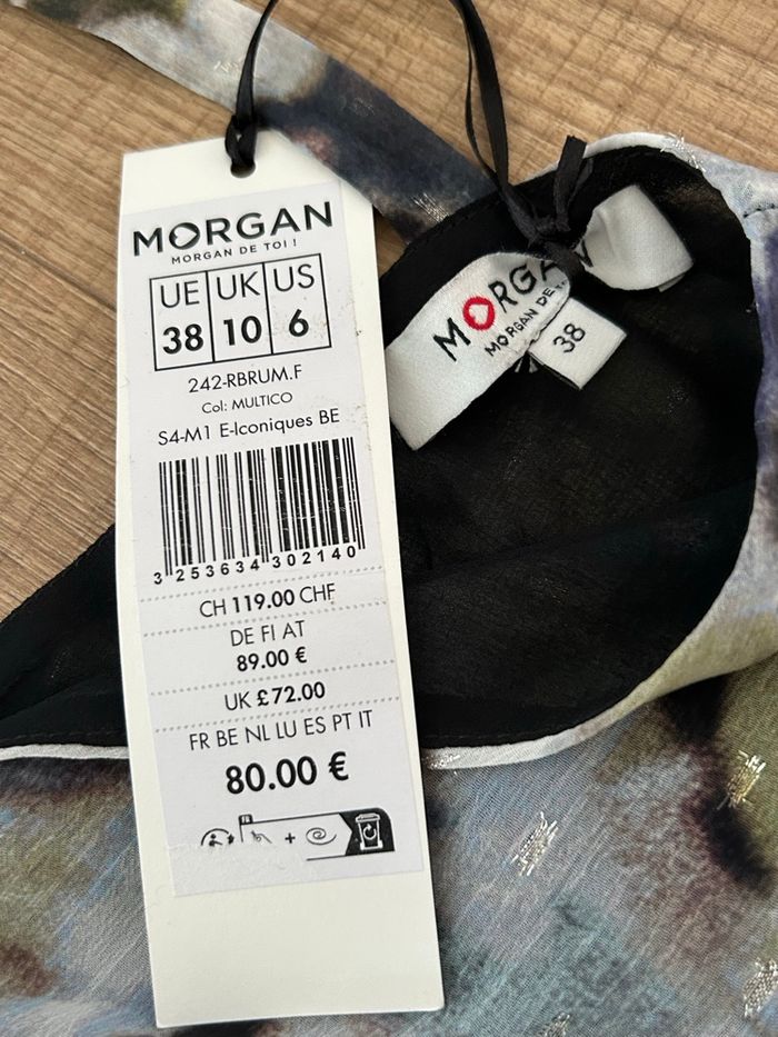Magnifique robe imprimée avec reflets argentés, de marque Morgan. Taille 38. Elle est neuve avec étiquette (valeur 80€). aisselle à aisselle 50 cms épaule à épaule 39 cms longueur manches 63 cms taille 38 cms et plus longueur depuis épaule 92 cms La taille est extensible 97% polyester et 3% fil métallisé