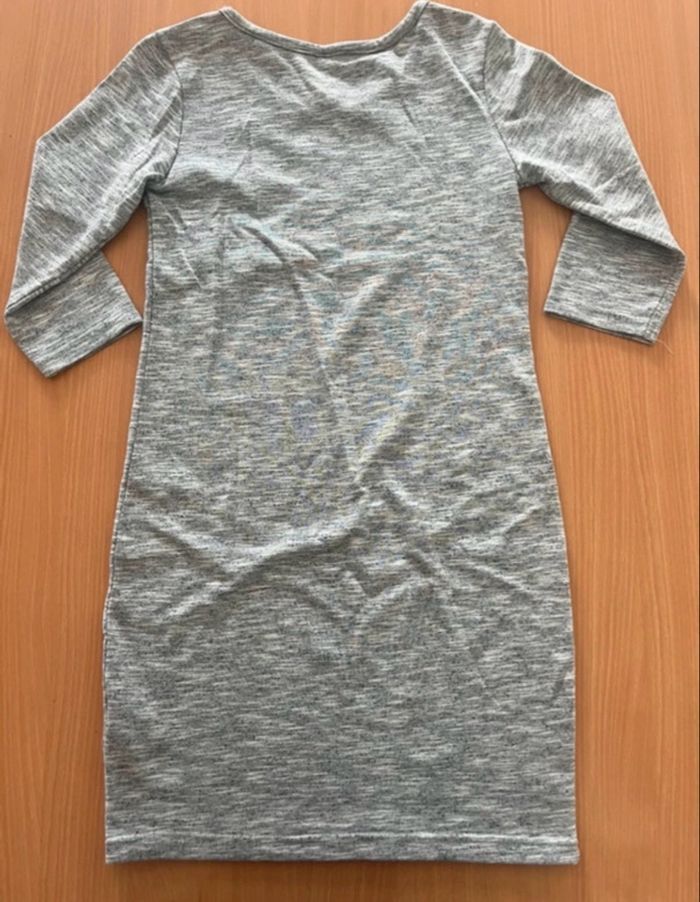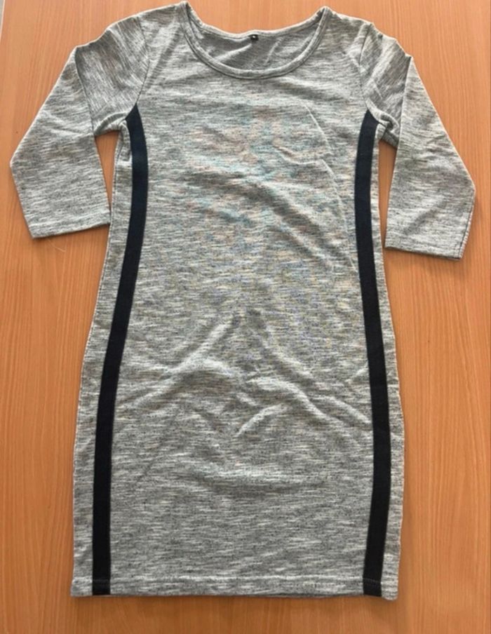 robe grise avec deux bandes bleu marine de chaque côté, manche mi longue, épaisse, en très bon état, taille S, sans marque.