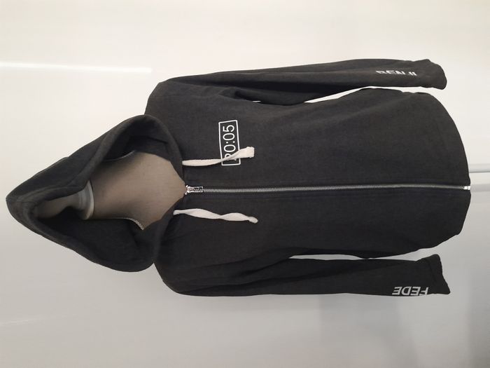 Veste à capuche, imprimé devant, derrière et bras, 2 poche, attache fermeture éclair devant Longueur : 58cm Aiss / Aiss : 57cm Matière : 95 % Coton, 5 % Elasthanne Marque : Kiabi