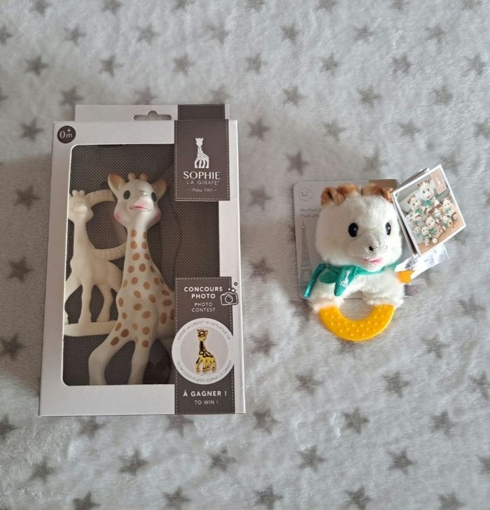 Lot Sophie la girafe avec anneau de dentition et un hochet peluche a mordiller neuf jamais utilisé