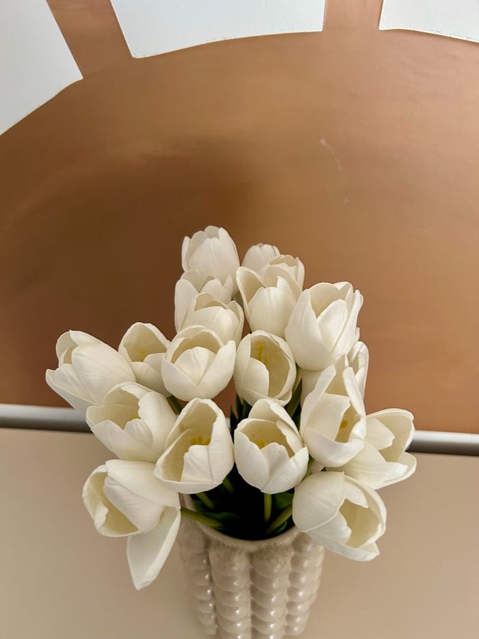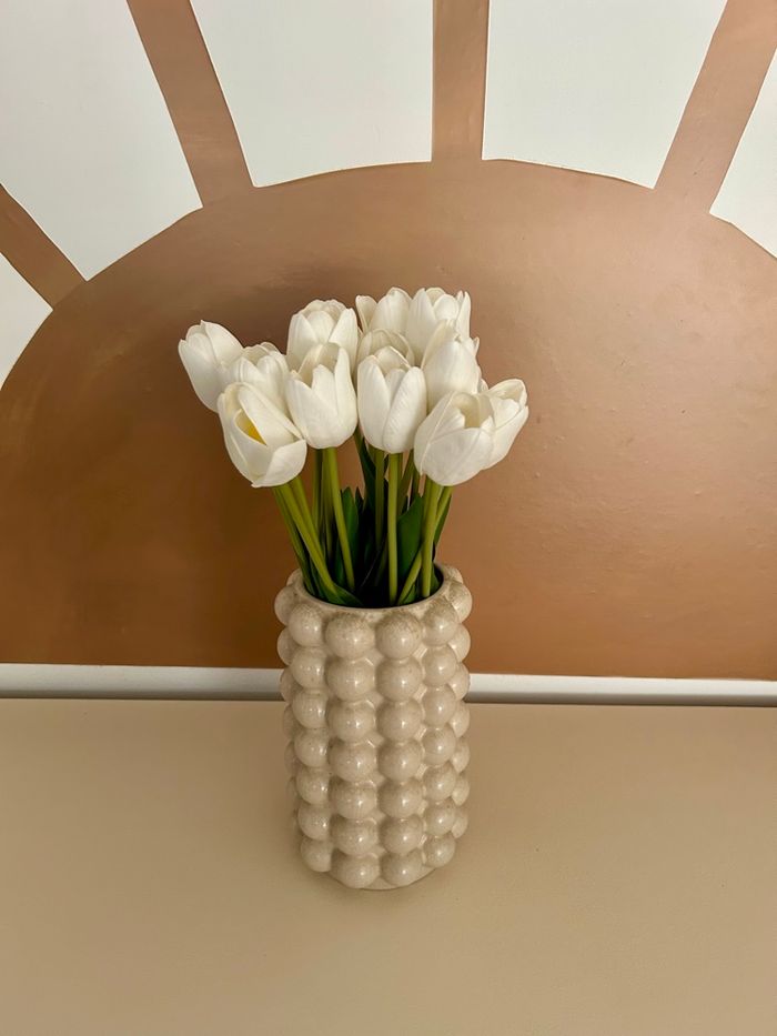 Hauteur 21,5 cm Diamètre interieur 9 cm Vendu avec les 10 tulipes artificielles (les tiges ont été coupées pour aller avec le vase)