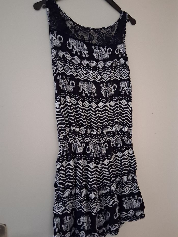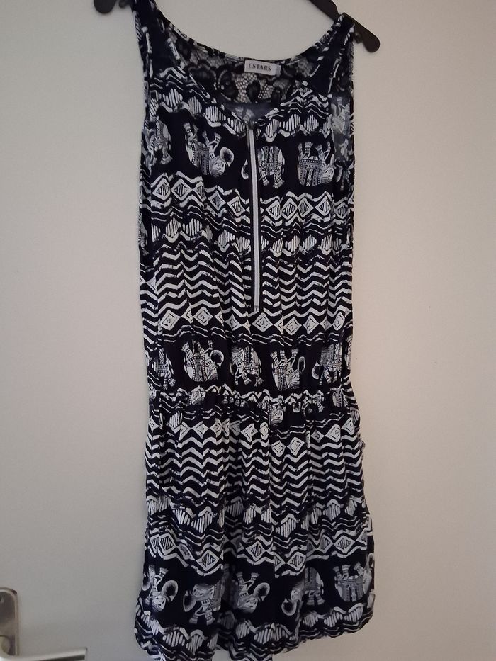 Combishort " j- stars" sans manche. Attache fermeture. Haut épaule derrière en dentelle. Taille élastique. En polyester T- S/M sur étiquette Noir et beige Excellent état
