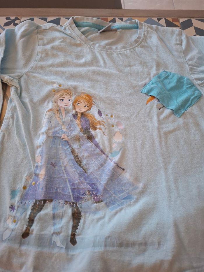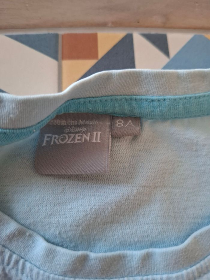 ° Pyjama pantalon + tee-shirt manches longues ° Taille 8 ans ° Reine des neiges ° Ensemble en bon état général, motif qui craquelle un peu