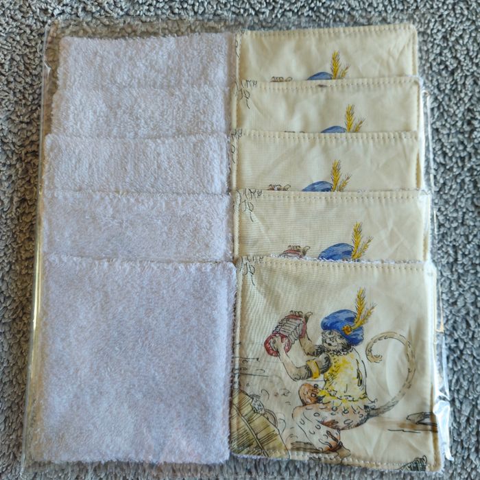 Lot 10 lingettes double face un côté tissu 100%coton motif singe et un côté éponge de coton blanc lavables jusqu'à 60 degrés Taille 12x12 cm Neufs jamais utilisés N'hésitez pas à me contacter pour la création de lots, réduction automatique à partir de 3 articles