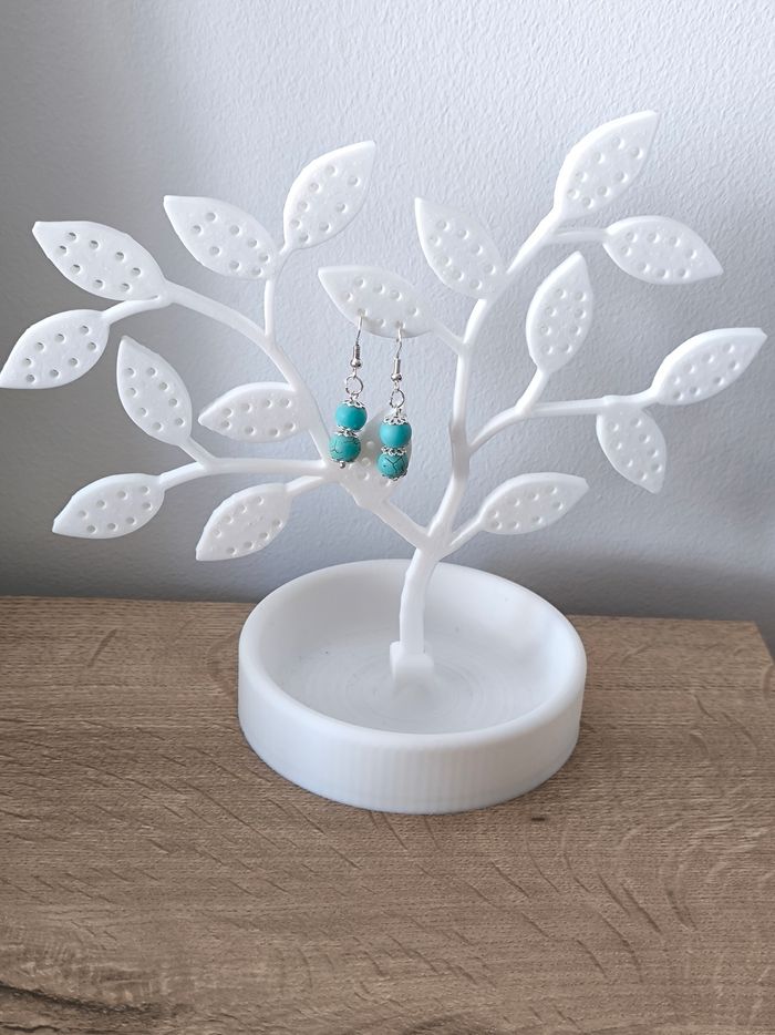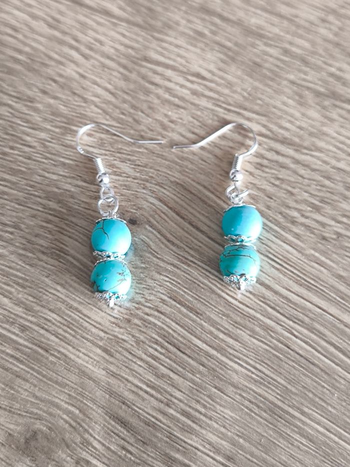 Les boucles d'oreilles sont pendantes avec perles bleues turquoises avec traits marron